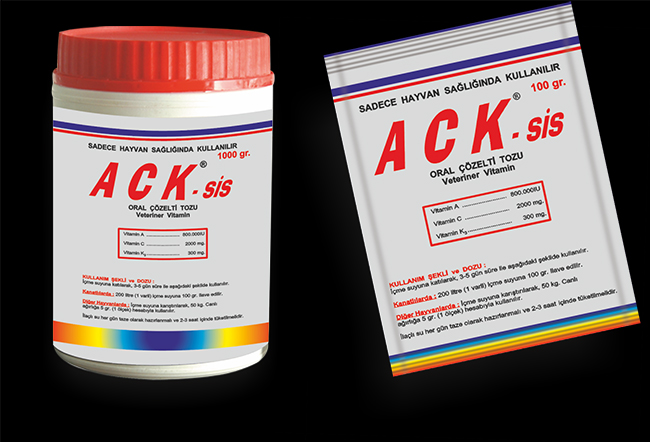 özellikle gelişme dönemindeki hayvanlarda aşırı doz ve uzun süreli kullanımda hipervitaminoz oluşabilir, (vitamin Aiçin) Bu nedenle uzun süre ve aşırı dozlarda kullanılmamalıdır. TİCARİ AMBALAJ ŞEKLİ: Ack-Sis, 20 ve 100 g.lık alüminyum poşetlerde (kutusuz) ve 1000g.lık plastik kutularda, 5g.lık ölçeği ile birlikte takdim edilmiştir. |