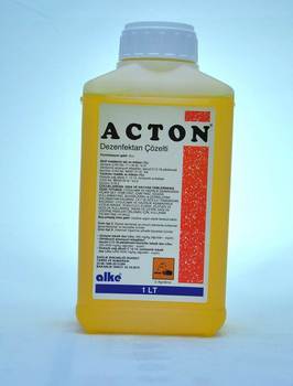 Bileşimi Acton Dezenfektan Çözeltisi, berrak, akışkan, sarımtırak renkli bir çözelti olup her 100 ml'sinde 15 g glutaraldehit ve 6 g benzalkonyum klorür içermektedir Kullanım şekli ve dozu Farklı amaçlara yapılacak dezenfeksiyon işlemlerine göre en uygun doz veya dilüsyonlar seçilmelidir. Ticari Takdim Şekli:1 L, 5L ve 20 L'lik yüksek densite polietilen plastik ambalajlarda satışa sunulmuştur.