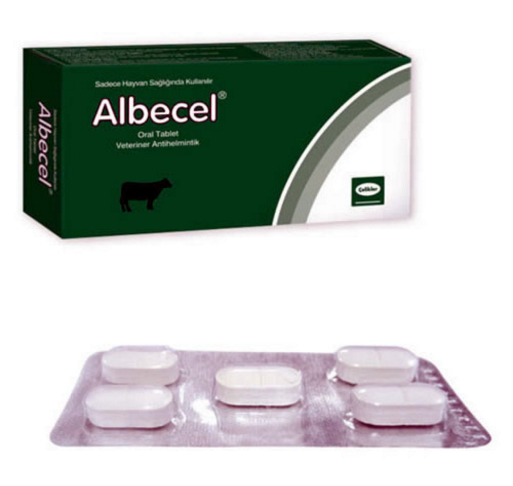 BİLEŞİMİ Her tablette 1200 mg Albendazol bulunur ENDİKASYONLAR ALBECEL Oral Tablet, sığırların mide-bağırsak, akciğer kılkurtlarının ergin, larva ve yumurtalarının, karaciğer kelebeklerinin ergin ve yumurtalarının, şeritlerin ergin ve genç şekillerine karşı kullanılır. Etkili olduğu parazitler: SIĞIR: Mide – bağırsak kıl kurtları; Trichostrongylus sp., Oesophagostomum sp., Haemonchus sp.,Cooperia sp., Ostertagia sp., Bunostomum sp., Chabertia sp., Gaigeria pachyscelis, Nematodirus sp.,Strongyloides sp., Trichuris sp. Akciğer kılkurtları; Dictyocaulus viviparus. Karaciğer kelebekleri; Fasciola heptica, F. gigantica, Dicrocoelium dentriticum (kum kelebeği) Şeritler; Moniezia sp. KULLANIM ŞEKLİ VE DOZU Veteriner hekim tarafından başka şekilde tavsiye edilmediği takdirde; Farmakolojik doz: Mide – bağırsak, akciğer kılkurtlarında 7.5 mg/kg canlı ağırlık dozunda; şeritlere karşı 10 mg/kg canlı ağırlık dozunda, F. hepatica ve F. gigantica’ya karşı 15 mg/kg canlı ağırlık dozunda, D. dentriticum’a (kum kelebeği) karşı 20 mg/kg canlı ağırlık dozundadır. Pratik doz: