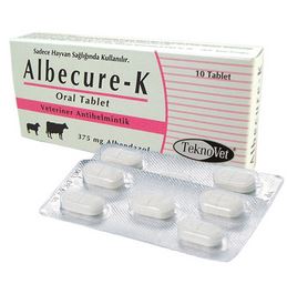 BİLEŞİMİ Her Albecure - K Oral Tablet 375 mg Albendazol içerir. KULLANIM YERİ /ENDİKASYONLARI Albecure – K Oral Tablet; sığır ve koyunlarda mide - barsak, akciğer kıl kurtlarının ergin, larva ve yumurtalarının, karaciğer kelebeklerinin ergin ve yumurtalarının, şeritlerin ergin ve genç şekillerine karşı tedavi ve korumasında kullanılır. SIĞIR : Mide - barsak kıl kurtları; Trichostrongylus sp., Oesophagostomum sp.,Haemonchus sp.,Cooperia sp., Ostertagia sp., Bunostomum sp., Chabertia sp., Gaigeria pachyscelis, Nematodirus sp., Strongyloides sp., Trichuris sp. Akciğer kıl kurtları; Dictyocaulus viviparus. KOYUN : Mide-barsak kıl kurtları; Trichostrongylus sp.,Oesophagostomum sp.,Haemonchus sp., Cooperia sp., Ostertagia sp., Bunostomum sp., Chabertia sp., Gaigeria pachyscelis, Nematodirus sp., Strongyloides sp. KULLANIM ŞEKLİ VE DOZU Albecure-K Oral Tablet, veteriner hekim tarafından başka şekilde tavsiye edilmediği takdirde; farmakolojik doz sığır ve koyunlarda mide - barsak ve akciğer kıl kurtlarına karşı 7.5 mg / kg canlı ağırlık, şeritlere karşı 10 mg / kg canlı ağırlık, Fasciola hepatica ve F. gigantica’ya karşı 15 mg/ kg canlı ağırlık, Dicrocoelium dentriticum’a (kum kelebeği) karşı 20 mg / kg canlı ağırlıktır. Tabletler bir defada oral yolla yutturularak uygulanır. Tabletler gerektiğinde ortasındaki çentikten kırılarak yarım tablet halinde de kullanılabilir. Eğer uygulama yarım tabletten daha düşük bir doz gerektiriyorsa tabletler suda eritilip bir kaç tane hayvana verilebilir. Pratik doz tablosu :
