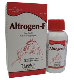 BİLEŞİMİ Her ml’sinde 3.3 mg Altrenogest içerir. KULLANIM YERİ /ENDİKASYONLARI Altrogen-F Oral Çözelti; 1. Kısrakların üreme sikluslarının düzenlenmesi ve kontrolünde;