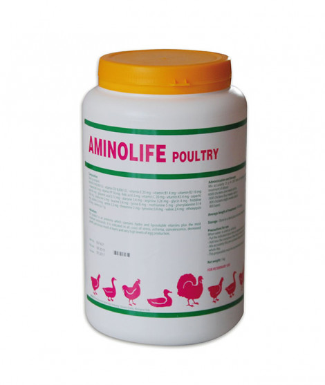 Aminolife Poultry, özellikle kümes hayvanları için formüle edilmiş, iyi dengelenmiş bir vitamin ve amino asit kombinasyonudur. Bu üründeki vitamin konsantrasyonları çok yüksektir. Bu yüksek konsantrasyonlar, bu ürün çözüldüğünde vitamin seviyelerinin normal gereksinimlerin çok üzerinde olacağı anlamına gelir. Rezervlerin tükenmesi ve zararı karşılanır ve optimum performans sağlanır. Büyüme, döşeme ve keratinize epitel için A vitamini. Kalsiyum ve fosfor homeostazı için D3 vitamini. Sinir hücreleri, kas lifleri ve eritrosit metabolizması üzerindeki antioksidan etkisi için E Vitamini. Kan pıhtılaşması için K3 vitamini. Çeşitli enzimatik sistemlerin aktivasyonu için B1, B2, B6 vitaminleri. Ana protein, şeker ve nükleotid ile ilgili metabolik reaksiyonlar için PP Vitamini. Doku proteini ve nükleotid oluşumu için folik asit. C vitamini, elektron vericisi olarak rolünde çeşitli enzimatik reaksiyonlarda rol oynar; bağışıklığı artırır ve organik direnci artırır.