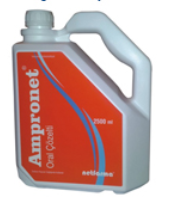BİLEŞİMİ Her 1 ml'si; 250 mg (221,1 mg baz amprolyuma eşdeğer) amprolyum HCI ve 2 mg Vitamin K içeren berrak, sarımsı renkte, akışkan ve suyla her oranda karışabilen oral çözeltidir. FARMAKOLOJİK ÖZELLİKLERİ: Ampronet Oral Çözelti'nin etken maddesi olan amprolyum, başlıca birinci nesil şizontlar üzerinde etkili olduğundan merozoitlerin gelişmesini engeller. İlacın gametositler ve sporozoitler üzerinde kısmen etkisi vardır.K3 vitamini, karaciğerde protrombin sentezinin gerçekleştirilmesi ve kanın pıhtılaşması ile ilgili fonksiyonlardan sorumludur. Oral uygulamayı takiben sindirim kanalından emilir ve direkt kan dolaşımına geçerek geniş ölçüde vücuda dağılır. KULLANIM YERİ / ENDİKASYONU: Ampronet Oral Çözelti tavuklarda Eimeria tenella, E. necatrix, E. acervulina, E. maxima ve E. brunetti; hindilerde E. adenoides, E. meleagridis ve E. dispersa' dan kaynaklanan klinik koksidiyoz olgularının sağaltımı amacıyla kullanılır. KULLANIM SEKLİ ve DOZU: Ampronet Oral Çözelti, farmakolojik dozu 23-73 mgAg canlı ağırlıktır. Broyler ve yumurtacı tavuklarda. 1 İt Ampronet 4-8 ton canlı ağırlığa içme suyuna 5 gün süreyle uygulanır. GIDALARDA İLAÇ KALINTI UYARILARI: Et ve yumurta için ilaç kalıntı arınma süresi (0) gündür. TİCARİ TAKDİM SEKLİ 1000 ml, 2500 ml HDPE plastik şişelerde takdim edilmiştir. |