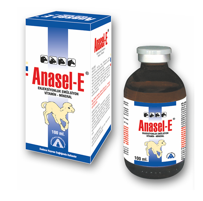BİLEŞİMİ ANASEL-E, 1 ml.'de, 1 mg. Selenyuma eşdeğerde Sodyum Selenit ile 60 mg. Vitamin E içeren, beyaz-açık renkli, steril bir emülsiyondur. KULLANIM YERİ/ENDİKASYONU ANASEL-E, vitamin E ve selenyum yetersizliği şartlarında beslenen gebelerin yeni doğan yavrularında meydana gelen beyaz kas hastalığının ve kas distrofilerinin k tedavisinde ve bu gibi gebelere verildiğinde ise, doğacak yavruların bu Selenyum eksikliğinden kaynaklanan fertilite ve üreme performansı bozuklukları, dişilerde döl tutma oranının ve erkek hayvanlarda eşeysel etkinliklerin artırılması, fötüsün normal gelişiminin sağlanması gibi selenyum eksikliklerine bağlı oluşan rahatsızlıklarda kullanılır. KULLANIM ŞEKLİ ve DOZU Genellikle deri altı, tek doz şeklinde; gerektiğinde 1 hafta sonra 2'nci bir doz ANASEL-E uygulaması yapılabilir. Veteriner hekim tarafından başka bir şekilde önerilmemiş ise; selenyum baz alınarak koruyucu olarak 0.05 mg./ks. sağaltıcı olarak 0.1 mg./kg. Selenyum hesabıyla aşağıdaki günlükdoz tablosu uygulanabilir. |