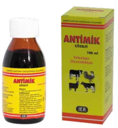 Antimik Çözelti; değişik oranlarda sulandırılarak, kümes, büyükbaş ve küçükbaş hayvan barınaklarının dezenfeksiyonu, kuluçkahane ve ekipmanlarının dezenfeksiyonu, besin endüstrisinde kullanılan ekipmanların dezenfeksiyonu, hayvanların içme ve kullanma sularının dezenfeksiyonu, çeşitli besin üretim birimlerinin dezenfeksiyonu, bulaşıcı ve salgın hastalık olgularında kapalı barınak havasının dezenfeksiyonu, hayvanların topluca bulundukları kontamine açık alanların dezenfeksiyonu, hayvan gübreleri,üretim ve çiftlik atıkları,hayvan sekret,eksret ve diğer atıklarıyla bulaşmış her çeşit malzeme dezenfeksiyonu,süthaneler,sağım makinaları, hayvan hastaneleri ile ameliyathanelerinin dezenfeksiyonu,cerrahi alet ve malzemelerin antisepsisi, piyeten, şap ve diğer ayak hastalıklarının iyileştirici sağaltımına yardımcı olmak amacıyla, cerrahi müdahalelerden