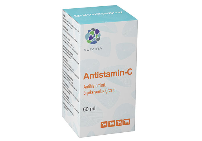 ANTISTAMIN-C BİLEŞİMİ Renksiz, berrak steril çözeltinin her ml' sinde 25 mg Klorfenamine eşdeğer Klorfenamin maleat bulunur. FARMAKOLOJİK ÖZELLİKLERİ Klorfenamin alkilamin yapısında bir antihistaminik maddedir.Dokularda histamin H-1 reseptör antagonisti olarak etkili olur. Kasiçi enjeksiyondan sonra kısa sürede dokulara tayılır ve 2 saat civarında bir yarı ömür gösterir. Uygulamadan 1 gün sonra dokularda tespit edilebilir seviyelerin altına iner ve metabolitleri halinde idrarla atılır. ÖZEL KLİNİK BİLGİLER VE HEDEF TÜRLER İÇİN UYARILAR Histaminik maddelerin açığa çıktığı çeşitli metabolik hastalıklarda spesifik tedaviye paralel olarak intravenöz klorfenamin uygulaması tedaviyi destekleyici etki sağlayabilir. Gebelikte kullanım: Önerilen dozlarda difenhidramin kullanımı gebelik yönünden güvenlidir. ISTENMEYEN / YAN ETKILERİ Nadiren aşırı susama belirtileri görülebilir İLAÇ ETKILEŞIMLERI Kortikosteroidlerle kombinasyon halinde kullanılabilir. Hafif sedatif etkisinden dolayı barbituratlar ve opiatlar ile birlikte kullanılmamalıdır. DOZ AŞIMINDA BELIRTILER , TEDBIRLER ve ANTİDOTU Yüksek dozlarda uyuşukluk, hipotansiyon , uriner retensiyon ve görüntü bulanıklığı meydana gelebilir. Uygulama kesilince belirtiler düzelir . Semptomatik olarak müdahale edilebilir. GIDALARDA İLAÇ KALINTI UYARILARI İlaç kalıntı arınma süresi (ikas) : Et ve sütte kalıntı güvenliği için tedavi edilen hayvanlar aynı gün kesime gönderilmemelidir. Enjeksiyon yeri için kalıntı arrınma sürei: 24 saattir. KONTRENDIKASYONLARI Fonksiyonel hepatik ve renal bozuklukları olan hayvanlarda kullanılmamalıdır. Klorfenamine aşırı hassasiyeti olan hayvanlara uygulanmamalıdır. GENEL UYARILAR Kullanmadan önce ve beklenmeyen bir etki görüldüğünde veteriner hekime danışınız. Çocukların ulaşamayacağı yerde bulundurunuz. MUHAFAZA ŞARTLARI VE RAF ÖMRÜ Raf ömrü imal tarihinden itibaren iki yıldır. Oda sıcaklığında (15-25 C ) ışıktan korunarak saklanmalıdır. TICARI TAKDİM ŞEKLİ Karton kutuda 20 , 50 ve 100 ml.lik bal rengi cam şişelerde arzedilir. PROSPEKTÜS ONAY TARIHI: 06.11.2007 TARIM VE KÖYIŞLERI BAKANLIĞI RUHSAT TARIHI VE NO: 06.11.2007 - 19/024 |