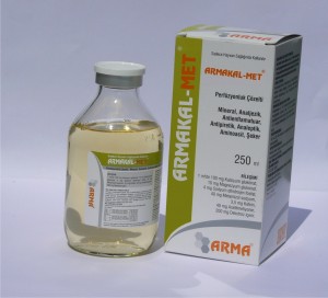 BİLEŞİMİ 1 ml’de 100 mg Kalsiyum glukonat, 10 mg Magnezyum glukonat, 4 mg Sodyum dihidrojen fosfat, 40 mg Metamizol sodyum, 3,5 mg Kafein, 40 mg Asetilmetiyonin, 200 mg Dekstroz içerir. FARMAKOLOJİK ÖZELLİKLERİ Armakal-MET Perfüzyonluk Çözelti, sığır ve atlarda kalsiyum, magnezyum ve fosfor noksanlıkları ile ilgili hastalıkların sağaltımı ve korunmasında, bu hastalıklarla birlikte seyreden enfeksiyonların sağaltımına destekleyici olarak, genel durum bozukluklarında, intoksikasyonlarda, metabolik bozukluklarda kullanılır. Analjezik, antipiretik, enerji verici, detoksifiye edici, karaciğer koruyucu, tonik, kardio-vasküler uyarıcı ve stabilize edici etkisi vardır. Kalsiyum kemiklerdeki hidroksi-apatitin önemli bir iyonudur. Ayrıca sinirsel uyarının geçişi, kasların kasılması, hücre içi haberleşmenin sağlanması ve kanın pıhtılaşmasında rol oynar. Fosfor ise lipit ve proteinlerle ester yapar. Kalsiyum ve fosfor birçok enzim sisteminde görev yapar. Özellikle ATP kanalıyla olmak üzere biyolojik enerjinin taşınması ve vücudun tampon sistemlerinde görevlidir. Magnezyum, özellikle yüksek enerjili fosfatın taşınmasına giren bir çok enzimin yardımcı faktörüdür. Ayrıca sinirsel uyarının geçişinde rol oynar. Metamizol, pirazolon grubu narkotik olmayan ağrı kesicidir. Prostaglandin sentetazın etkinliğini engelleyerek ağrı kesici, ateş düşürücü ve yangı önleyici etki oluşturur. Spazmolitik etkisi de vardır. Kafein, ksantin türevi, merkezi sinir sistemini uyaran bir ilaçtır. Çizgili ve düz kaslar ile kalp kası üzerine etkilidir; çizgili kas verimliliğini artırır. Solunum merkezini uyararak, solunum hızı ve derinliğini artırır. Kalp-damar merkezini uyarır ve çevre damarları genişletir. Böbreklerden geçen kan akımını hızlandırır, glomerüler damarları genişletir, tubüllerden suyun geri emilmesini azaltması sonucu idrar miktarını artırır. Metionin, esansiyel bir amino asittir. Metionin sülfür içerir, sistin ve sistein biyosentezi için sülfür sağlayıcısıdır. Fosfatid sentezinde yer alır, karaciğerden yağ asitlerinin taşınmasını artırır. Karaciğerde sisteine metabolize olur. Dekstroz, parenteral beslenmede acil enerji ihtiyacını karşılamak amacıyla, karbonhidrat kaynağı olarak kullanılır. Armakal-MET Perfüzyonluk Çözelti’deki etkin maddeler plazma proteinlerine bağlanırlar ve değişik derecelerde metabolize olurlar. Etkin maddelerin metabolitleri başlıca idrar yoluyla atılır, sadece magnezyum başlıca dışkı ile atılır. TİCARİ TAKDİM ŞEKLİ 100 ve 250 ml’lik renksiz cam şişelerde/karton kutuda takdim edilmiştir. |