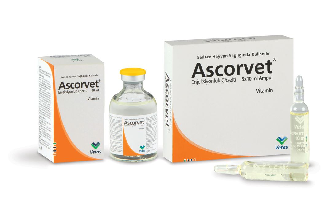 ASCORVET BİLEŞİMİ ASCORVET Enjeksiyonluk Çözelti, çok açık sarı renkte, kokusuz, berrak bir çözelti olup beher ml.'de; 250 mg askorbik aside (Vitamin C) içerir. FARMAKOLOJİK ÖZELLİKLERİ ASCORVET Enjeksiyonluk Çözelti, açık sarı renkli, berrak bir çözeltidir. C vitamini olarak bilinen askorbik asit, gelişmiş canlılarda, sağlıklı yaşamın sürdürülmesi, büyüme, gelişme ve optimum verimlilik için kesinlikle gerekli olan mikro besinlerden biridir. Canlı vücudundaki başlıca fizyolojik etkiler yükseltgenmeler başta olmak üzere, çok yönlü biyokimyasal tepkimelere karışma durumuyla yakından ilişkilidir. Bu kapsamda olmak üzere, organizmada gerçekleşen çok yönlü yükseltgenme ve indirgenme tepkimelerinde hidrojen taşıyıcısı olarak görev yapar. Doğrudan karıştığı tepkimelerin önemli bir kısmı hayvanlarda mezenşimal kökenli dokuların yapımı ve bütünlüğünün korunmasıyla yakından ilişkilidir. Böylece, kemik ve dişlerin matriksi ile kapiller endotel hücreler arası bağlayıcı dokuların oluşumuna katılan kollagen, proteoglikanlar ve diğer organik katılımcı maddelerin sentezi gerçekleşir. Belirtilen fizyolojik ve farmakolojik etkileri, askorbik asidin skorbüt hastalığına yönelik koruyucu ve sağaltıcı etkilerine temel oluşturur. Askorbik asit, adrenal kabuk ile eşem bezlerinde hazırlanan hormonların sentezlenmesi ve salgılanması için belirleyici öneme sahiptir. Bu yöndeki etkinlikleriyle, evcil hayvanların stres yaratan olumsuzluk etmenlerine karşı direncini arttırır, immun sistemi destekler ve uyarır; üreme performanslarını güçlendirir. A ve E vitaminlerinin in vivo etkilerini destekler, onlarla in vivo sinerjistik etkileşime girer ve aynı vitaminlerin fizyolojik değerlerinin korunmasına olanak sağlar. Belirtilenlere koşut olarak, pek çok metabolik olaylar ile sentez tepkimelerinde görevli amidleştirici enzimlerin etkinliğini artırır, dopamin ve noradrenalin hidroksillenmesine yardımcı olur. Aynı zamanda, hematopoetik sistemi uyararak kan yapımını artırır. Askorbik asit, proteinlerden hidroksimetil lizin sentezine ve bunun da karnitine çevrilmesine aracılık eder. Böylece, aşırı efor ve stres olgularında gereksinme duyulan enerji transferini kolaylaştırır. Karaciğerde mikrozomal enzimlerce gerçekleştirilen ilaç metabolizmasında, folik asidin folinik asite çevrilmesinde ve tirozin metabolizmasında önemli görevler yüklenir. Askorbik asidin difteri toksinini bağlayarak zehirliliğini azalttığı, özellikle böbrek üstü bezi ile mide ve bağırsaklarda hasara yol açan enfeksiyonlarda, anaflaktik şoka ve zehirlenmelere karşı koruyucu olduğuna ilişkin çok sayıda bilimsel kanıt bulunmaktadır. Evcil hayvanlarda paranteral yolla verilen askorbik asit hızla emilerek hücre içi yapılar da dahil geniş ölçekte tüm vücuda dağılır. Lökosit ve trombositlerdeki yoğunluğu, plazma ve alyuvarlardakinden daha yüksektir. Vücuttaki bezli yapılarda yüksek, kas ve yağ dokuda düşük oranda bulunur. Vücutta sınırlı ölçüde depolanır. Başta sıçanlar olmak üzere, bütün memelilerde (insanlar hariç) glikozdan başlanarak d-glukuronik asit ve l-glukuronik asit üzerinden askorbik asit sentezlenir. Askorbik asit, hayvan vücudundan başlıca karaciğerde olmak üzere, diğer bazı dokularda karbondiokside kadar parçalanır. Dışarıdan alınan ve endojen olarak sentezlenen askorbik asit ve metabolitleri başlıca idrarla vücuttan atılır. İSTENMEYEN YAN ETKİLER Askorbik aside karşı evcil hayvanların toleransı iyidir. Önerilen dozlarda kullanıldığında, bilinen bir yan etkisi bulunmamaktadır. Farklı yollardan yüksekçe dozlarda ve sık sık tekrarlanarak verilen askorbik asit tüm evcil hayvanlarda kusma, ishal, mide sancısı, deride peteşiyal kızarıklık, böbrek tubulüslerinde kalsiyum okzalat kristalleri oluşumuna ve aşırı ürinasyona sebep olabilir. İLAÇ ETKİLEŞİMLERİ Askorbik asit, demir tuzları, yükseltgeyici ajanlar ve özellikle bakır olmak üzere, ağır metal tuzlarını içeren ilaçlarla geçimsizdir. Bu nedenle birlikte kullanılmamaları gerekir. Günlük 10 mg üzerinde alınan askorbik asit, kumarin veya inandiyon türevleri gibi antikoagulan ilaçların mide-barsaklardan emilimini azalttığı bildirilmiştir. Askorbik asit, başta şeker için idrar testi olmak üzere laboratuar test sonuçlarını etkileyebilir. İdrarda asitleşmeye neden olabileceğinden, idrarda aminoglikozitler, eritromisin gibi bazı antibiyotiklerin etkinliğini azaltabilir. Kalsiyum içeren serumlarla karıştırılmamalıdır. DOZ AŞIMINDA BELİRTİLER, TEDBİRLER VE ANTİDOT C vitamininin toksisite riski oldukça düşüktür. Ancak aşırı dozlarda kullanıldığında ve sık sık tekrarlanarak verilen askorbik asit tüm evcil hayvanlarda kusma, ishal, mide sancısı, deride peteşiyal kızarıklık, böbrek tubulüslerinde kalsiyum okzalat kristalleri oluşumuna ve aşırı ürinasyona sebep olabilir. Böyle durumlarla karşılaşıldığında ilaç uygulamasının durdurulması ve hayvana bolca su verilmesi yeterlidir. KONTRENDİKASYONLAR Urolithiazis şüphesi olan hastalarda kullanılmamalıdır. GIDALARDAKİ İLAÇ KALINTI UYARILARI İlaç kalıntı arınma süresi (i.k.a.s): Et ve süt için "0" sıfır gündür. GENEL UYARILAR Kullanmadan önce ve beklenmeyen bir etki görüldüğünde veteriner hekime danışınız. Çocukların ulaşamayacağı yerde bulundurunuz. MUHAFAZA ŞARTLARI VE RAF ÖMRÜ 2°C - 25°C arasında, rutubetsiz ortamda saklandığında raf ömrü üretim tarihinden itibaren 24 aydır. Ampul formu açıldığında bir defada kullanılmalıdır. TİCARİ TAKDİM ŞEKLİ Karton kutularda 5 adet 10 ml'lik renksiz ampullerde ve 20 - 50 ve 100 ml'lik renksiz flakonlarda piyasaya arz edilmektedir. SATIŞ YERİ VE ŞARTLARI Veteriner hekim reçetesi ile eczanelerde ve ve