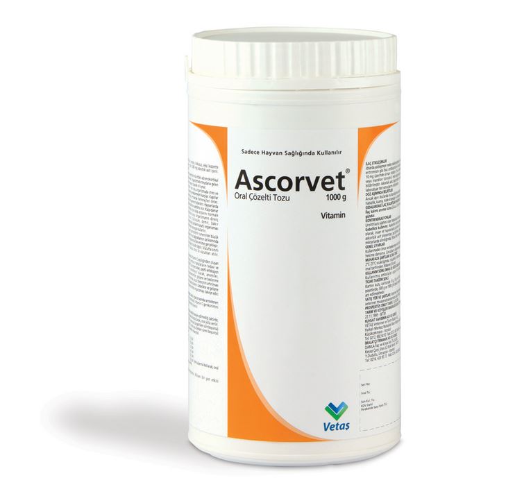 BİLEŞİMİ Beher g'da 1.000 mg askorbik asit içerir. KULLANIM SAHASI/ENDİKASYONLAR ASCORVET, bütün evcil hayvanlarda Vitamin C eksiliğinden oluşan ya da Vitamin C gereksinmesini arttıran hastalıkların tedavi ve korunmasında kullanılır. ASCORVET, tüm stres halleri, çeşitli enfeksiyon hastalıklarında asıl tedaviye destekleyici olarak, anemiler, entoksikasyonlar, hemoraji, gastroenteritler, gelişme ve beslenme bozuklukları, damar cidarının korunması, vücut direncinin artırılması ve organizmanın genel uyarıcısı olarak kullanılır. Gebelikte ve gelişme bozukluklarında, diğer vitaminlerle birlikte organizmayı takviye edici olarak önemli rol oynar. ASCORVET, kümes hayvanlarında;Kanatlı organizmasında sentezlenen C vitaminin yetersiz kaldığı durumlarda, Vitamin C gereksinimini artıran enfeksiyon ve stres hallerinde kullanılır. KULLANIM ŞEKLİ VE DOZU Veteriner hekim tarafından başka şekilde tavsiye edilmediği taktirde; ASCORVET, hayvanların içme sularına karıştırılarak, oral yolla verilir. Kümes Hayvanlarında: 5 g / 200 lt. içme suyu (öngörülen süre boyunca) Kümes Hayvanlarında: 30 g/ 100 lt. içme suyu (tedavi süresi boyunca) (Antibiyotik tedavisine destek vermek amacıyla) Diğer çiftlik hayvanlarında: 20 kuzu veya 20 oğlak için 5 g / gün 10 koyun veya 10 keçi için 5 g / gün 4 buzağı için 5 g / gün 2 dana için 5 g / gün 1 at/ 1 inek için 5 g / gün 50 tavşan için 5 g / gün içme sularına katılarak, oral yolla öngörülen süre boyunca verilir. |