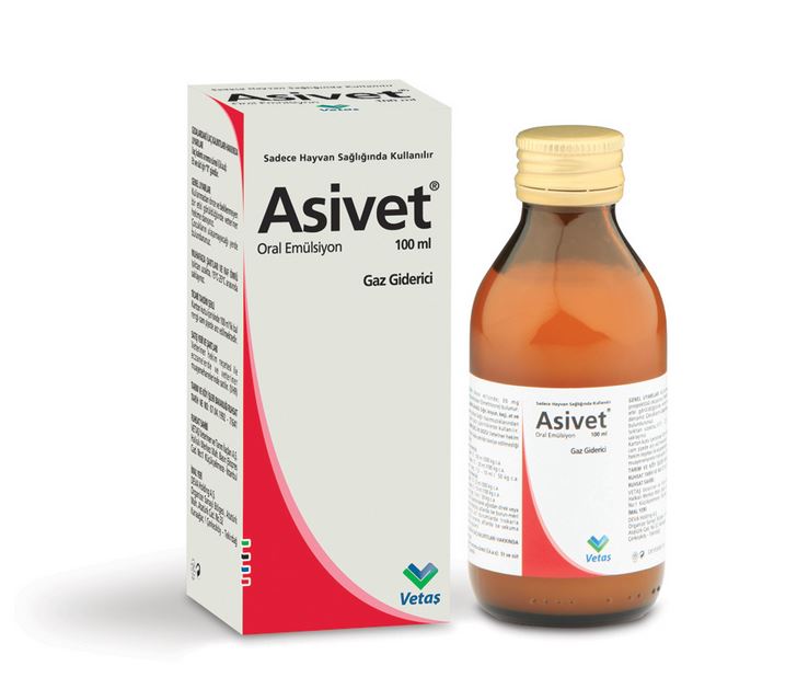 BİLEŞİMİ Beher ml'de 30 mg Dimetilpolisiloksan (Simethicone) bulunur. KULLANIM SAHASI/ENDİKASYONLAR Geviş getiren hayvanlarda (sığır, koyun, keçi): Rumenlerinde gaz birikmesi ve şişkinliğe karşı kullanılır. Hayvanların ilkbaharda aniden ahırdan bol ve taze ot bulunan çayırlara veya yazın dane yem bulunan tarlalara çıkartılması sonucu oluşan, rumenin köpüklü şişkinliklerinde gazı rumen içeriğinden ayırarak rumen sondası vasıtasıyla veya hayvanın geviş getirmesini sağlamak suretiyle gazın kolaylıkla dışarı alınmasında yardımcı olur. Ayrıca ASİVET, koruyucu amaçla ruminantlarda meraya çıkarılmadan önce verilerek gıdai şişkinliklerin önüne geçilmesi sağlanabilir. At ve taylarda: Gıdai hazımsızlıklarından ileri gelen gazlı şişkinliklerde kullanılır. KULLANIM ŞEKLİ VE DOZU Veteriner hekim tarafından başka şekilde tavsiye edilmediği takdirde; Dimetilpolisiloksan'ın farmakolojik sağaltım dozu; 8 - 10 mg/kg canlı ağırlıktır. Tedavi amacıyla; At - Sığır 75 - 100 ml / 300 kg canlı ağırlık Tay - Dana 15 - 20 ml / 100 kg canlı ağırlık Koyun - Keçi 7.5 - 10 ml / 50 kg canlı ağırlık ASİVET' in rumen ve mide içeriği ile iyi karışabilmesi için 1 veya 2 litre su içinde verilmesi tavsiye olunur. Sığır, koyun ve keçilere oral yolla direkt içirilerek ya da rumen sondası ile at ve taylara ise burun meri sondası ile uygulanır. Emülsiyon kullanılmadan önce şişe iyice çalkalanmalıdır. Akciğer üzerindeki basıncı azaltmak için hayvan eğimli bir yere çekilmelidir. Genellikle bir kez ilaç uygulaması sağaltım için yeterlidir. Gerekli görüldüğünde 6 - 8 saat sonra aynı dozlar tekrarlanabilir. Oral yolla; Tavsiye edilen miktardaki emülsiyon bol su ile (5- 10 misli ) karıştırılarak verilir. Genellikle tek uygulama yeterlidir. Rumen içi, Sekum içi yolla; Ruminantlarda uygulamalar ağızdan direk veya rumen sondasıyla, atlarda ise burun-meri sondasıyla yapılmalıdır. Çok acil durumlarda asepsi ve antisepsi kurallarına çok iyi uyularak trokarla sığırlarda sol fossa paralumbalisten rumene, tek tırnaklılarda ise sekuma girilir. Önce bir miktar gaz çıkarılır, sonra emülsiyon sulandırılmadan içeriye verilir. Koruma amacıyla; At - Sığır 10 -25 ml./ 300 kg canlı ağırlık Tay - Dana 5- 10 ml / 100 kg canlı ağırlık Koyun - Keçi 5 ml / 50 kg canlı ağırlık Meraya çıkarılmadan önce profilaktik olarak, tavsiye edilen miktarlardaki emülsiyon 5- 10 misli sulandırılarak içirilir veya burun meri sondası ile verilir. |