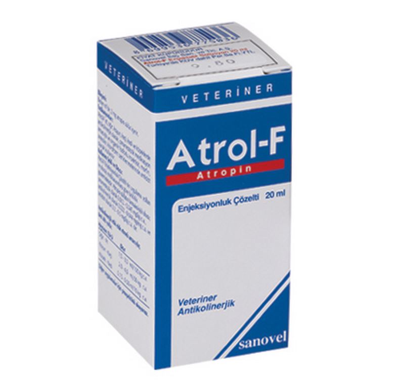 BİLEŞİMİ Her ml’sinde 2 mg atropin sülfat içerir. KULLANIM SAHASI/ENDİKASYONLARI ATROL-F, at, sığır, koyun, keçi, kedi ve köpeklerde aşağıdaki endikasyon sahalarında kullanılır: Antikolinerjik etki oluşturmak amacıyla: Kalp-solunum yetmezliği, Bağırsak, uterus spazmları; kolikler, Midriyazis sağlanarak gözün muayenesi, Çeşitli bradikardi tiplerinin ayrımı (Organik kalp hastalığı kökenli bradikardilerde enjeksiyonu takiben yarım saat içinde nabız hızlanır.), Özellikle atlarda olmak üzere, kronik amfizemli hayvanlarda bronşların genişletilerek solunumun geçici olarak rahatlatılması. Preanestezik medikasyon amacıyla: Operatif anestezilere hazırlık amacıyla tükürük ve bronş salgılarının azaltılması, vago-vagal refleksler ile artan vagal tonusun kalp üzerindeki olumsuz etkilerinin önlenmesi (Özellikle travmalı kedi ve köpeklerin anesteziye hazırlanmasında analjeziklerle birlikte başarılı sonuçlar elde edilir). Antidot olarak: Organik fosforlu insektisid, morfin, arekolin, kloroform zehirlenmeleri. KULLANIM ŞEKLİ VE DOZU ATROL-F Enjeksiyonluk Çözelti' nin uygulama yolları ve dozajı endikasyonlara göre farklılık göstermektedir. Atropin sülfatın farmakolojik dozu; preanestezik olarak 0,012–0,045 mg/kg, antikolinerjik olarak 0,022–0,044 mg/kg ve antidot olarak 0,2–0,5 mg/kg dır. Antikolinerjik etki elde etmek amacıyla; deri altı yolla: Sığır - At 1,50 - 3,00 ml/100 kg Preanestezik medikasyon amacıyla: Organik fosforlu insektisidlerle zehirlenmelerde antidot olarak; damar içi ve deri altı yolla: Sığır 15,0 - 30,0 ml/100 kg |