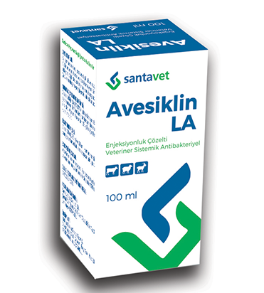 Avesiklin LA Bileşimi: Sarı-kahverengimsi renkli berrak, steril çözeltinin her ml’si 200 mg Oksitetrasikline eşdeğer Oksitetrasiklin dihidrat içerir. FARMAKOLOJİK ÖZELLİKLERİ Oksitetrasiklin tetrasiklin grubuna ait geniş spektrumlu bir antibakteriyeldir. Tetrasiklinler, bakterilerde 50 S ribozamal alt birimlere bağlanır ve amino asit tRNA’nın buraya bağlanmasını engelleyerek, protein sentezini bozarlar. Gram-negatif bakterilere, birisi basit geçiş, diğeri de etkin taşıma olmak üzere iki yoldan geçiş yaparlar. Gram-pozitif bakterilere girişlerinde ise etkin taşıma daha fazla rol oynar. Tetrasiklinler, ikinci derecede olmakla beraber, bakteriyel enzimlerin yapısındaki metallerle şelat yaparak etkinliklerini engelleyebilmektedir. Oksitetrasiklinin bakterilere olan etkisi aşağıdaki gibidir: Gram-pozitif aeroblar (Bacillus sp., Corynebacterium spp., Erysipelothrix rhusiopathiae, Listeria monocytogenes ve Streptococci.), Gram-negatif bakteriler (Actinobacillus sp., Bordetella spp., Francisella tularensis, Haemophilus spp., Pasteurella multocida, P. haemolytica, Yersinia spp., Campylobacter fetus, Borrelia sp. ve Leptospira sp., Moraxella bovis), anaeroblar (Actinomyces sp., Fusobacterium sp.) ve Mycoplasma spp., Chlamydia sp., Ehrlichia sp., Coxiella burnetii, Ehrlichia, Theileria, Eperythrozoon ve Anaplasma’lara etkisi iyi derecededir. Kazanılmış direnç nedeniyle Staphylococci, Enterococci, Enterobacter spp., Enterobacteriaceae familyasına dahil Enterobacter spp., E. coli, Klebsiella spp., Proteus spp., Salmonella spp., Anaerop bakterilerden Bacteroides spp. ve Clostridium sp.’ye etkisi değişkendir. Mycobacterium sp., Proteus vulgaris, Pseudomonas aeruginosa, Serratia sp., Mycoplasma bovis ve M. hyopneumoniae tetrasiklinlere dirençli kabul edilir. Uygulamadan sonra 4–8 saat içinde en yüksek plazma konsantrasyonuna ulaşır ve 72 saate kadar etkili konsantrasyonu korur. Yoğun olarak böbrek, karaciğer, dalak ve akciğerlerde birikim gözlenir. Büyük bir bölümü böbreklerden elimine edilirken % 10 kadarı değişmeden feçesle atılır. Avesiklin LA KULLANIM SAHASIAvesiklin LA, Sığır, koyun ve keçilerde oksitetrasikline duyarlı bakterilerden kaynaklanan: