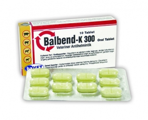 BİLEŞİMİ Her tablet 300 mg albendazol içerir. KULLANIM YERİ/ ENDİKASYONLAR BALBEND-K 300 Oral tablet koyunların ve sığırların mide, bağırsak, akciğer kılkurtlarının ergin, larva ve yumurtalarının, karaciğer kelebeklerinin ergin ve yumurtalarının, şeritlerin ergin ve genç şekillerinin tedavisi ve enfeksiyonlarından korunmada kullanılır. Koyunlarda: Karaciğer kelebekleri : Fasciola hepatica, F. gigantica, Dicrocoelium dendriticum Mide nematodları : Haemonchus sp., Ostertagia sp., Trichostrongylus axei İnce bağırsak nematodları: Trichostrongylus sp., Nematodirus sp., Cooperia sp., Bunostomum sp., Strongyloides papilosus Kalın bağırsak : Chabertia ovina, Oesophagostomum sp., Trichuris sp., Akciğer kılkurtları : Dictyocaulus filaria Şeritler : Moniezia sp., Sığırlarda: Karaciğer kelebekleri : Fasciola hepatica, F. gigantica, Dicrocoelium dendriticum Mide nematodları : Haemonchus placei, Ostertagia sp., Trichostrongylus axei İnce bağırsak nemetodları: Trichostrongylus sp., Nematodirus sp., Cooperia sp., Bunostomum sp., Strongyloides papilosus Toxocara vitulorum Kalın bağırsak : Chabertia ovina, Oesophagostomum sp., Trichuris sp., Akciğer kılkurtları : Dictyocaulus viviparus Şeritler : Moniezia sp., UYGULAMA ŞEKLİ VE DOZU Veteriner hekim tarafından başka şekilde tavsiye edilmediği takdirde; farmakolojik doz sığır ve koyunlarda; mide-bağırsak-akciğer kılkurtlarında 7,5 mg/kg canlı ağırlık dozunda; şeritlere karşı 10 mg/kg canlı ağırlık dozunda, F. hepatica ve F. gigantica’ya karşı 15 mg/kg canlı ağırlık dozunda, D. dendriticum’a (kum kelebeği ) karşı 20 mg/kg canlı ağırlık dozunda albendazoldür. BALBEND-K 300 oral tablet; 1 defada oral yolla yutturularak uygulanır. Tablet çentikli olduğundan kolaylıkla ortasından kırılıp yarım tablet olarak da kullanılabilir. PRATİK DOZ TABLOSU (Tablet)
