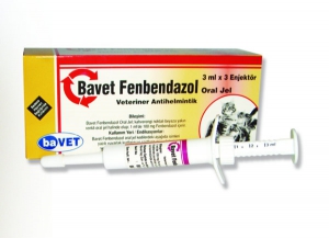 BİLEŞİMİ 1 ml’de 100 mg Fenbendazol içerir. KULLANIM YERİ / ENDİKASYONLAR BAVET FENBENDAZOL Oral Jel kedilerde yuvarlak kurtların, şeritlerin mücadelesi ve kontrolünde antihelmintik olarak kullanılır. Fenbendazol aşağıda isimleri yazılı yuvarlak kurtlar ve şeritlerin mücadele ve kontrolünde etkilidir. Yuvarlak kurtlar: Toxocara cati, Toxascaris leonina, Ancylostoma tubaeforme, Trichuris serrata Şerit: Taenia taeniaformis UYGULAMA ŞEKLİ VE DOZU Veteriner hekim tarafından başka şekilde tavsiye edilmediği takdirde: kedilerde Fenbendazol’ün farmakolojik dozu 50 mg/kg canlı ağırlıktır. Ürünün her ml ‘sinde 100 mg Fenbendazol bulunur ve 1 ml ürün 2 kg canlı ağırlığın tedavisi içindir. Her enjektör derecesi ½ ml ürün ihtiva edip 1 kg canlı ağırlık tedavisinde kullanılır. Ağız yoluyla uygulanan bir üründür. Mücadeleye günde bir defa olmak üzere birbirini takip eden üç (3) gün süre ile devam edilir. |