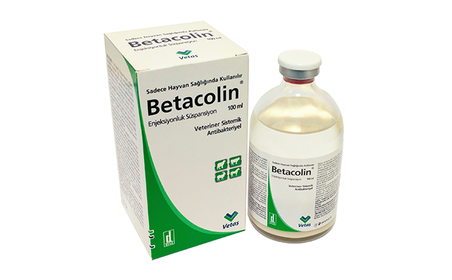 Sadece Hayvan Sağlığında Kullanılır BETACOLİN Enjeksiyonluk Süspansiyon Veteriner Sistemik Antibakteriyel BİLEŞİMİ BETACOLİN Enjeksiyonluk Süspansiyon, kirli krem renkli, yağlı ve steril bir süspansiyon olup beher ml’sinde etkin madde olarak 100 mg Amoksisilin’e eşdeğer Amoksisilin trihidrat ve 250.000 I.U. Kolistin sülfat, yardımcı madde olarak da kolliphor EL, kolloidal silika anhidrus ve fraksiyonel hindistan cevizi içerir. FARMAKOLOJİK ÖZELLİKLERİ BETACOLİN Enjeksiyonluk Süspansiyon, amoksisilin ve kolistin olmak üzere iki antibiyotikten oluşan bir preparattır. Gram pozitif ve gram negatif bakterilere karşı etkili yarı sentetik bir penisilin olan amoksisilin bakteri hücre duvarı sentezini inhibe ederek etki eder. Polimiksinlere benzer siklik bir polipeptid antibiyotik olan kolistin, E. coli, Salmonella spp., Enterobacter aerogenes, Haemophilus spp., Pseudomonas spp., Shigella spp., Bordetella spp. gibi Gram negatif mikroorganizmalara karşı selektif olarak etkilidir. Gram pozitif bakterilere karşı etkililiği ise zayıftır. Kolistin intraselüler materyal kaybı ile birlikte hücre membranını bozarak etki eder. Ancak, tam olarak anlaşılmamış olan direnç kavramı nadir görülmektedir. Kolistin polimiksin sınıfına ait bir polipeptit antibiyotiktir. Kolistin duyarlı bakteri suşlarında hücre membranını bozarak hücre geçirgenliğinde değişikliğe ve intrasellüler materyal kaybına yol açarak bakterisidal etkisini gösterir. Kolistin özellikle Escherichia coli olmak üzere Enterobacteriaceae bakterini içeren Gram-negatif bakterilere karşı bakterisidal etkiye sahiptir. Amoksisilin, asidik ortamda stabildir ve parenteral yoldan uygulamada emilim hızlı ve tamdır. Kanda bulunan miktarın yaklaşık %15’i plazma proteinlerine bağlanır. Yaygın ve hızlı bir şekilde dağılır ve ortalama MIC değerlerinden daha yüksek olan kan ve doku konsantrasyonları elde edilir. Kandakine göre daha yüksek ve daha kalıcı olan doku düzeylerine ulaşır. Yüksek akciğer tropizmi gösterir ve bronşiyal mukusta kan konsantrasyonunun iki katı konsantrasyona ulaşır. Bakteriyel lizis, ampisilinle elde edilenle karşılaştırıldığında çok daha hızlıdır. Toksisite göstermez. Aktif formda özellikle idrar yolu ile atılır. Kolistin parenteral uygulamada hızla emilir. Esas olarak değişmeden idrarla atılır ve glomerüler infiltrasyona uğrar. Az bir kısmı safra ve anne sütü ile atılır. Parenteral yoldan uygulanan aynı kombinasyon, her iki etkin madde vasıtası ile sistemik tedavi sağlar ve esas olarak gram pozitif bakterilerle ilgili direnci kırarak daha yüksek başarı olasılığı sağlar. KULLANIM SAHASI BETACOLİN Enjeksiyonluk Süspansiyon, sığır, koyun, keçi ve atlarda amoksisilin-kolistin kombinasyonuna duyarlı olan gram pozitif ve gram negatif mikroorganizmalara bağlı sindirim sistemi, solunum sistemi, üriner sistem ve deri sistemi enfeksiyonlarının tedavisinde endikedir. KULLANIM ŞEKLİ VE DOZU Veteriner hekim tarafından başka şekilde tavsiye edilmediği takdirde; Uygulama öncesinde süspansiyonun homojen dağılması için flakonu iyice çalkalayınız. Sığır, keçi, koyun ve atlarda antibiyogram sonuçlarına göre amoksisiline duyarlı olduğu belirlenen patojenlerin oluşturduğu enfeksiyonlarda (MİK: ≤1 µg/ml). Vücut ağırlığının her kilogramı için günde bir kere 10 mg amoksisilin ve 25.000 I.U kolistin tek doz halinde enfeksiyonun prognozuna göre 3 ya da 5 gün boyunca derin kas içi (intramuscular) olarak uygulanmalıdır. Amoksisiline orta derecede duyarlı olduğu belirlenen patojenlerin oluşturduğu enfeksiyonlarda (MİK: 2≤4 µg/ml) yukarıda belirtilen dozda günde iki uygulama yapılmalıdır. Pratik doz: 10 kg vücut ağırlığı için 1 ml süspansiyon derin kas içi (intramuscular) olarak uygulanır. ÖZEL KLİNİK BİLGİLER VE HEDEF TÜRLER İÇİN ÖZEL UYARILAR Direnç oluşumunu önlemek için sadece amoksisilin ve kolistine duyarlı patojenlerin oluşturduğu enfeksiyonların tedavisinde, tedavi doz ve sürelerine uygun olarak kullanınız. Bir dozun uygulamasının unutulması durumunda çift doz uygulama yapmayınız. Duyarlılık testinin tedavi başlanmadan önce uygulanması önerilir. Enjeksiyonlar uygulanırken normal aseptik koşulları sağlayınız. Enjekte edilecek hacmin büyük olduğu daha büyük hayvanlarda enjeksiyon uygulanırken enjeksiyonun iki veya daha fazla noktadan bölünerek uygulanması tavsiye edilir. BETACOLİN Enjeksiyonluk Süspansiyon’un uygunsuz kullanımı, amoksisilin ve kolistine dirençli bakteri insidansında bir artışa yol açabilir. Önerilen dozu aşmayınız. Gebelikte ve Laktasyonda Kullanım: Gebelik döneminde veteriner hekimin risk/yarar oranı değerlendirmesi ile uyumlu bir şekilde kullanınız. Laktasyondaki hayvanlarda kullanılmamalıdır. İSTENMEYEN ETKİLER Amoksisilin veya kolistine karşı duyarlı olduğu bilinen hayvanlarda kullanılmamalıdır. Nadiren aşırı duyarlılık reaksiyonları gelişebilir. Aşırı duyarlılık reaksiyonları dozla ilgili değildir ve ürtikerden anaflaksiye değişen bir şekilde ateş, eozinofili, nötropeni, agranulositoz, trombositopeni, lökopeni, anemi ve lenfadenopati gelişebilir. Enjeksiyon bölgesinde ağrı ve sertleşme olabilir. İLAÇ ETKİLEŞİMLERİ Bakteriostatik antibiyotiklerle (kloramfenikol, eritromisin ve diğer makrolitlerle, tetrasiklinlerle ve sülfonamidlerle) in vitro antagonizma gözlenmiştir. Bunun klinik önemi tam olarak açıklanmamıştır ancak birlikte kullanımları önerilmemektedir. Probenesid penisilinlerin tubulerlerden salgılanma şeklinde eliminasyonunu bloke eder ve serum yarı ömrünü artırır. Aminoglikozitler gibi nefrotoksik etki potansiyeli olan ilaçlarla birlikte kullanılmamalıdır. Kürar benzeri kas gevşeticilerle ve solunum depresyonu yaratabilecek ilaçlarla birlikte uygulanmamalıd