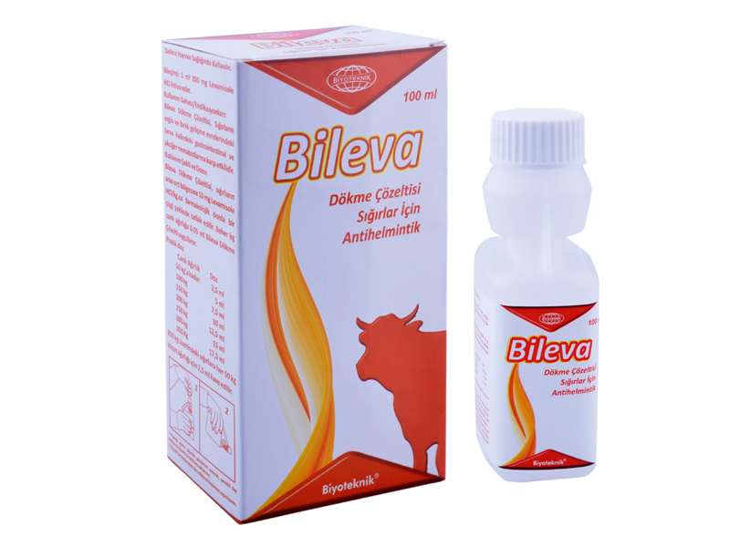 Bileva Dökme Çözelti Sığırlar İçin Antihelmintik BİLEŞİMİ: 1ml Bileva Dökme Çözelti 200 mg Levamisole HCl ihtiva eder. Bileva Dökme Çözeltisi beyaz renkte bir çözeltidir. FARMAKOLOJİK ÖZELLİKLERİ: Bileva Dökme Çözelti Levamisole HCl ihtiva etmektedir. Levamisole HCl, İmidatiyazol türevi olan Tetramisole’nın levo izomeridir. Tetramizol dozunun yarısı dozda Levo izomerinin kullanılmak suretiyle aynı etkinlik sağlanabilmektedir. Böylece daha yüksek dozda ilaç kullanılmasından doğabilecek toksisite sakıncaları bertaraf edildiği gibi ilacın güvenirlilik eşiği de artmaktadır. Yetişkin ve farklı gelişme evrelerindeki larvalar halindeki gastroenteral ve akciğer nematodlarına karşı etkili bir şekilde kullanılmaktadır. Levamisole HCl, nematodların sinir sistemine kolinerjik agonist gibi davranarak asetilkolin nörotransmitter eksitatöre benzer bir aktivite gösterir. Bu da spastik kas paralizine sebep olur. Levamisole aynı zamanda fumarat redüktazı inhibe ederek nematodların enerji akımını kesmekte rol oynar. Bileva Dökme Çözelti nematodların sinir sistemindeki ganglionları stimüle ederek parazitlerde nöromüsküler paralize sebep olmaktadır. Bu yüzden ovisidal değildir. Bileva Dökme Çözelti’nin aktif maddesi olan Levamizol HCl suda çözünen bir bileşik olduğundan dermal tatbikattan sonra deri tarafından süratle absorbe edilerek bütün vücuda yayılır. 1-6 saat içinde maksimum kan seviyesine ulaşır, 24 saat içinde çoğu metabolize olur ve % 6 sından çok azı değişmeden idrarla atılır. Plasma yarılanma oranı sığırlarda 4-6 saat olup metabolitleri çoğunlukla idrar ile olmak üzere dışkı vasıtası ile atılır. KULLANIM SAHASI/ENDİKASYONLARI: Bileva Dökme Çözelti, Sığırların ergin ve farklı gelişme evrelerindeki larva halindeki gastrointestinal ve akciğer nematodlarına karşı etkilidir. Akciğer Nematodları: Dictyocaulus viviparus Gastro-intestinal Nematodlar: Trichostrongylus sp, Cooperia sp., Oestertagia ostertagi (larva durumunda inhibe eder), Haemonchus sp., Nematodirus sp., Bunostomum sp., Oesophagostomum sp., Chabertia sp.. KULLANIM ŞEKLİ VE DOZU: Bileva Dökme Çözelti, sığırların arka sırt bölgesine 10 mg Levamisole HCl/kg.ca farmakolojik dozda bir çizgi şeklinde tatbik edilir. Beher kg canlı ağırlığa 0,05 ml Bileva Dökme Çözeltisi uygulanır. Pratik doz 350 kg üzerindeki sığırlara her 50 kg vücut ağırlığı için 2,5 ml ilave edilir. ÖZEL KLİNİK BİLGİLER VE HEDEF TÜRLER İÇİN UYARILAR: Sadece haricen kullanılır. Hayvanlar ıslak iken ilaç tatbik edilmemelidir. İlaç tatbikatından en az 1 saat hayvanın ıslanmamasına dikkat edilmeli ve yağmurda kalmamalıdır. Gebelikte Kullanım: Tavsiye edilen dozlarda gebelerde güvenlidir. İSTENMEYEN ETKİLER: Bazı sığırlarda burunda köpük veya hipersalivasyon görülür. Ayrıca heyecanlanma, titreme, dudak yalama ve baş sallamada görülebilen yan etkilerdir. Ancak bütün bu belirtiler tavsiye edilen dozun çok üstüne çıkıldığında görülebilir. Diğer taraftan Bileva Dökme Çözeltisi organofosfatlarla birlikte kullanıldığında da bu belirtiler görülebilir. Bu semptomlar genellikle ilacın kesilmesiyle 2 saatte kaybolur. İLAÇ ETKİLEŞİMLERİ: Piperazin tuzları ile antagonistik etki nedeniyle birlikte kullanılmamalıdır. Tetrahidropirimidinler (pirantel ve morantel tuzları) ile birlikte kullanılması toksisite artışına yol açabilir. Levamizol ile yapılacak olan sağaltımlardan 14 gün önce ve sonra organik fosforlu insektisit bileşiklerle birlikte kullanılmamalıdır. DOZ AŞIMINDA BELİRTİLER, TEDBİRLER: Bileva Dökme Çözelti‘nin doz aşımında görülen toksik semptomlar hipersalivasyon, aşırı hassasiyet, kramp, CNS depresyonu, nefes darlığı, defekasyon, idrar yapma ve kolaps görülür. Tedavide sıvı sağaltımı ve semptomatik tedavi uygulanır. Levamizol zehirlenmelerinde organik fosforlu insektisit zehirlenmelerinde olduğu gibi damar içi atropin sülfat sağaltımı önerilmektedir. GIDALARDAKİ İLAÇ KALINTILARI HAKKINDA UYARILAR: İlaç kalıntı arınma süresi (i.k.a.s.): Son ilaç uygulanmasında eti için yetiştirilen sığırlarda 21 gün geçmeden kesime gönderilmemelidir. Sütü insan tüketimine sunulan sağmal sığırlarda kullanılmamalıdır. KONTRENDİKASYONLAR: Levamizol duyarlılığı bilinen hassas hayvanlarda kullanılmamalıdır. Karaciğer ve böbrek yetmezliği bulunan hayvanlarda kullanılmamalıdır. Organik fosforlu bileşiklerle birlikte kullanımı Levamizol’e bağlı olarak kontrendikedir. Bu sebeple ilaç uygulamasından 14 gün önce ve 14 gün sonra organik fosforlu bileşikler kullanılmamalıdır. GENEL UYARILAR: Kullanmadan önce ve beklenmeyen bir etki görüldüğünde veteriner hekime danışınız. Kullanmadan önce prospektüsü okuyunuz. Çocukların ulaşamayacağı yerlerde muhafaza ediniz. UYGULAYICININ ALMASI GEREKEN TEDBİRLER: Bileva Dökme Çözelti sağlam ciltten absorbe olabilir. Bu yüzden uygulayıcı kauçuk eldiven giymelidir. Uygulama iyi havalandırılmış yerlerde yapılmalıdır. Bilhassa göze ve deriye bulaşma olduğunda bulaşık yerler hemen bol su ile 15 dakika süreyle yıkanmalıdır. Bulaşık elbiseler hemen çıkarılmalıdır. Yanlışlıkla ve kaza sonucu ağızdan alındığında kusturulmalı ve en kısa sürede doktora başvurulmalıdır. KULLANIM SONU İMHA HEDEF OLMAYAN TÜRLER İÇİN UYARILAR: Irk ve sürü duyarlılığı sebebiyle keçilerde normal dozlarda bile zehirlenmeler ve ölüm görülebilir. Atlar için son derece tehlikelidir. Levamizole bağlı olarak 20 mg/kg.ca dozda bile ölüme yol açabilir. Kedi ve köpekler için ölüme neden olabilecek şekilde zehirlidir. MUHAFAZA ŞARTLARI VE RAF ÖMRÜ: Oda sıcaklığında, ışıktan koruyarak saklayınız. Raf ömrü imal tarihinden itibaren 2 yıldır. TİCARİ TAKDİM ŞEKL
