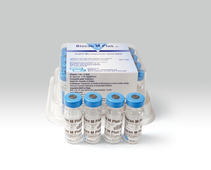 Bileşim - 1 mi: M. canis min. 1x106 vejetatif form Hedef Tür: Köpekler, Kediler Endikasyonlar: Köpekler ve kedilerde Microsporium canis'in sebep olduğu mikozisin (mantar) önlenmesi ve tedavisinde kullanılır. Uygulama Şekli ve Dozu: Hayvanlar en erken 2 aylık iken aşılanmalıdır. Doz: Hayvanların yaşı, ağırlığı ve ırkına bakılmaksızın 1 ml'dir. Uygulama: Kediler: Kürek kemiğinin arkasına deri altı (SC) veya kalça bacak kasına kas içi (IM) Köpekler: Kalça bacak kasma kas içi (İM) Birinci ve ikinci uygulama aynı yere yapılmamalıdır. Bu nedenle birinci aşı vücudun sol tarafına yapılırsa ikinci aşı sağ tarafına yapılmalıdır. Kullanmadan önce şişe iyice çalkalanmalı ve vücut ısısına getirildikten sonra uygulanmalıdır. Bağışıklık - Aşılama Programı: Koruyucu veya tedavi amaçlı olarak ilk defa aşılanacak hayvanlara ilk aşıdan 14-21 gün sonra tekrar (rapel) aşılama yapılır. Tedavi amaçlı kullanımda, inatçı ve yaygın enfeksiyon durumunda gerekirse ikinci aşılamadan 18-24 gün sonra üçüncü bir aşı uygulaması yapılabilir. Bağışıklık ikinci aşılamadan sonra 1 ayda oluşur ve en az 1 yıl sürer. Hayvanlarda daimi bağışıklığın sağlanması için aşılama her yıl tekrarlanmalıdır. BIOCAN M plus diğer Bioveta aşıları ile aynı anda, vücudun farklı yerlerinden uygulanmak koşuluyla kullanılabilir. Kontrendikasyonları: Genel ateşli hastalık durumlarında kullanılmamalıdır. İlk aşıdan bir hafta önce ve ikincisinden 14 gün sonraya kadar (gerekirse, üçüncüden) diğer antimikotik ilaçlar ve farklı aşı uygulamaları \apılmamalıdır.( Bioveta a.s. tarafından üretilen diğer Biocan aşıları ile aynı zamanda uygulanabilir.) Uyanlar: Sağlıklı olan hayvanlara uygulama yapılmalıdır. Her hangi bir antiparaziter uygulama, aşılamadan 10 gün önce yapılmalıdır. Aşılanan hayvanlar eğitime veya zor performanslara tabi tutulmamalıdır. Gerekli testler henüz gerçekleştirilmediği için gebe hayvanlara uygulama önerilmez. Yan Etkiler: Aşılama yerinde kendiliğinden 3 hafta içinde kaybolan lokal bir reaksiyon (bezelye büyüklüğünde) oluşc-bilir. Duyarlı hayvanlarda hipersensitivite nadir olarak oluşabilir. Yasal Arınma Süresi: Yoktur Saklama Koşullan: Kuru, karanlık bir yerde 2 / 8 °C de muhafaza edilmeli ve aşı dondurulmamalıdır. Raf Ömrü: Üretim tarihinden itibaren 18 ay'dır. Ambalaj Şekli: 2 x 1 ml, 10 x 1 ml, 20 x İmi, 50 x 1 ml ve 100 x 1 ml'lik ambalajlarda satışa sunulmuştur. İmha Şartlan: Müstahzara ait ambalajın ve atıkların imhası geçerli düzenlemelere göre yapılmalıdır |