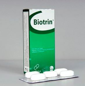 BİLEŞİMİ Her tablet: Sülfadiazin 1000 mg,Trimetoprim 200 mg içerir. ENDİKASYONLARI Biotrin Tablet; ruminasyonu başlamamış kuzu, buzağı, oğlaklar ile köpek ve kedilerde: -Üst ve alt solunum yolu enfeksiyonları (pnömoni, bronşit) İnek, kısrak ve koyunlarda: -Genital kanal enfeksiyonlarında (metrit) kullanılır. KULLANIM ŞEKLİ VE DOZU Veteriner hekim tarafından başka şekilde tavsiye edilmediği taktirde; Oral yolla: Ruminasyonu başlamamış buzağı, kuzularda; 20 kg canlı ağırlık için günde 1/2 tablet, kedi ve köpeklerde 10 kg canlı ağırlık için günde % tablet uygulanır. Günlük doz ikiye bölünerek 12 saat arayla verilir. Tedaviye 5 gün devam edilir. Tablet olduğu gibi ya da suda eritilerek verilir. Sağaltıma 7 günden fazla devam edilmemelidir. Uterus İçi: Biotrin Tablet, post-partum enfeksiyonlarda intrauterin olarak da kullanılır. İnek ve kısraklarda: Günde 2 - 4 tablet Koyunlarda : Günde 1 - 2 tablet İntrauterin uygulama, doğrudan tabletin tatbiki ile yapılabildiği gibi tabletin suda eritilmesinden sonra, sonda ile uterus içerisine verilerek de yapılabilir. |