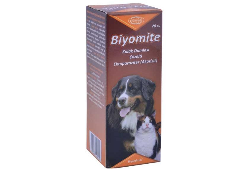 Biyomite Kulak Damlası Çözelti Bileşimi: Sarı renkli ,berrak,karakteristik kokulu çözeltinin Beher 20 ml’sinde: Tetramethrin : 0,030 g a/h Piperonyl butoxide : 0,300 g a/h bulunur. Farmakolojik Özellikleri: Tetramethrin sentetik bir piretroid insektisittir. Doğal piretrinlere benzer şekilde temas ve mide zehiri olarak etki eder. Piperonyl butoxide sinerjik etkisini göstererek Tetramethrin’in etkisini arttırır. Diğer sentetik piretroidler gibi Tetramethrin’in en önemli ve dikkat çekici özelliği parazitler üzerinde çok güçlü, hızla yere serici etkinliğe sahip olmasıdır. Bu guruptaki insektisitler önemli lipofilik niteliğe sahiptir. Böylece parazit insektlerin lipoid moleküllerince zengin kutikulasından kolayca geçerek etki noktalarına ulaşırlar. Bu aşamadan sonraki zehirli etkileri iki yönlü olarak gelişir. Bir taraftan yüzeysel sinir ganglionlarına tutunarak parazitin bütün etkinliğini bloke ederler. Diğer yandan da bir çeşit sinir zehiri gibi davranarak insekt parazitlerin sinir sistemini uyarmak suretiyle dengesiz hareketler, uyumsuzluk, kaslarda eksitasyon, konvulsiyon, genel felç durumu, koma ve ölüm meydana getirirler. Üçüncü kuşak piretroidler gibi Tetramethrin geniş bir dış paraziter spektrumuna sahiptir. Etki alanına giren mera ve mesken keneleri, uyuz etkenleri, sokucu ve emici bit türleri, pireler, kan emici artropodların larva ve yumurtalarını ovisidal etki göstererek öldürür. Toksisite: Bütün piretroidler gibi Tetramethrin de güvenli bir ektoparaziterdir. Dünya Sağlık Örgütü’nün (WHO) sınıflandırmasına göre toksisite sınıfı II’dir. Kullanım Sahası ve Endikasyonlar: Kedi ve Köpeklerin; Kızarıklık, kalınlaşma, salgı artışı, ağrı ve kaşıntı ile karakterize olan kulak içine yerleşen uyuz etkenlerinden (Ododectes cynotis) ileri gelen Otitis Externanın (Dış kulak iltihabı) sebep olduğu enfeksiyon ve kaşıntıların tedavisinde kullanılır. Kullanım Şekli ve Dozu: Tedavinin başarılı olması için tedaviye başlamadan önce kulak içindeki kir ve kulak mumunun temizlenmesi gerekmektedir Kaynatılmış ılık su kulak irigasyon puvarının içine çekildikten sonra kulak içine yavaşça sıkılır. Bu işlem kulak kirden temizleninceye kadar 3-4 defa yapılır. Arkasından ılık su ile kulak durulanır ve kurutulur. Tedavinin başarılı olması için diğer bir şart ise kulak akarlarının hayat siklusunun kırılması için yeterli bir süre ilaç tatbik edilmesidir. Tedavi takvimine göre; bütün kulak mumu ve kirleri kulak kanalından temizlenir. Biyomite Kulak Damla Çözeltisi aşağıdaki miktarlarda kulak içine mümkün olduğunca derine damlatılır ve elle masaj yapılarak dağıtılır.