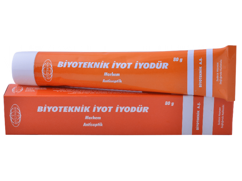 Biyoteknik iyot iyodür Antiseptik Bileşimi: % 2 İyot, % 10 Potasyum iyodür ihtiva eder. Koyu kahverengi renkte, karakteristik kokuya sahip bir merhemdir. Farmakolojik Özellikleri: Biyoteknik İyot İyodür haricen kullanılan bir merhemdir. Jermisid etkisi olduğundan kuvvetli bir antiseptiktir. Kullanım Sahası / Endikasyonlar: Tüm hayvanlarda kuvvetli antiseptik tesiri sebebiyle deri üzerine lokal antiseptik, operasyon bölgesinin dezenfektasyonu, yüzeysel ve derin yaraların temizlenmesi, deri veya deri altı şişliklerde resolutif (eritici, dağıtıcı) ve revulsif (kan çekici) olarak kullanılır. Kullanım Şekli ve Dozu: Veteriner hekim tarafından başka şekilde tavsiye edilmedikçe; hastalıklı bölgeye sürülmek suretiyle; 3-4 gün kullanılır. Gebelikte Kullanım: Gebe hayvanlarda da kullanılır. Hedef Türler İçin Özel Klinik Bilgiler ve Uyarılar:Hastalarda iyoda karşı bazen aşırı duyarlılık oluşabilir. Değişik tipte döküntüler ve ateş meydana gelebilir. İstenmeyen Etkiler: Uzun süre devamlı kullanıldığında deride irkilti ve kızarıklığa neden olabilir. İlaç Etkileşimleri: İyot; alkaliler, amonyak, kloralhidrat, fenol, sodyum tiyosülfat, nişasta ile geçimsizdir. Dokuda kimyasal bir yanık oluşturabileceğinden civalı antiseptiklerle birlikte kullanılmamalıdır. Gıdalarda İlaç Kalıntı Uyarıları: İlaç Kalıntı Arınma Süresi (i.k.a.s) “0” gündür. Kontrendikasyonları: Açık ve çok geniş yaralarda kullanılmamalıdır. Genel Uyarılar: -Kullanmadan önce ve beklenmeyen bir etki görüldüğünde veteriner hekiminize danışınız. -Çocukların ulaşamayacağı yerlerde bulundurunuz. Muhafaza Şartları ve Raf Ömrü: Kendi ambalajı içinde, kuru ve serin yerde muhafaza ediniz. Direkt güneş ışınlarından koruyunuz. Raf ömrü üretim tarihinden itibaren 4 yıldır. Ticari Takdim Şekli: Karton kutu içinde 100, 150, 200, 250, 500 g’lık beyaz renkli plastik kavanozlarda ve 80 g’lık alüminyum tüplerde. |