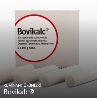 Bovikalc Bovikalc doğum sonrası hipokalsemi riski olan ineklerde kullanılan, yüksek düzeyde kalsiyum içeren oral diyet takviyesidir. Bovikalc aynı zamanda süt hummasının enjeksiyonluk kalsiyum ile tedavisi sonrasında takviye olarak da kullanılabilir. Bileşenler (Her Bolusta): Kalsiyum klorür, kalsiyum sülfat, asetik asit ile esterleştirilmiş yağ asitlerinin mono ve digliseridleri. Katkı Maddeleri (Her Bolusta): Analitik Bileşenler: Her bolus 43 gram kalsiyum içerir. Kalsiyumun % 71’i kalsiyum klorürden, % 29’u kalsiyum sülfattan sağlanmaktadır. Bovikalc sodyum, fosfor veya magnezyum içermez. Uygulama sonrası bolusları kaplayan madde rumende erir ve bolus yaklaşık 30 dk içerisinde tamamen parçalanır. Kalsiyum klorür rumende hızlıca çözünürken, kalsiyum sülfat rumen mikroflorası tarafından parçalanarak kalsiyumun yavaş salınımını sağlar. Kullanım TalimatıHipokalsemi riski olan süt sığırlarında özellikle süt verimi yüksek ve daha önce süt humması hikayesi olanlarda kullanılır. Kullanmadan önce veteriner hekime veya bir beslenme uzmanına danışılması önerilir. Hipokalsemi riskini azaltmak için kullanıldığında: Kalsiyum enjeksiyonunu desteklemek amacıyla kullanıldığında: Uygulama aplikatör ile yapılmalıdır. Bovikalc Güvenlik Tavsiyeleri Sadece hayvan sağlığında kullanılır. Süt hummasının klinik semptomları görülen ineklerde yutma refleksinin bozulmuş olabileceği göz önünde bulundurularak uygulama yapılmamalıdır. Yatan inek sendromu görülen ineklerde (paraliz) kullanılmamalıdır. Bolusun kaplama materyali hasar görmüş ise veya bolus kırılmış ise uygulama yapılmamalıdır. Takdim şekliHer kutu 4 adet bolus içerir (Her bolus 192 gram). Saklama koşulları Çocukların ulaşamayacağı yerde bulundurunuz. Kuru bir yerde, en fazla 30 °C’de orijinal ambalajında saklanmalıdır. |