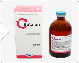 BUTAFAN BİLEŞİMİ Butafan Enjeksiyonluk Çözelti, berrak, pembe renkli, partikülsüz ve steril bir enjeksiyonluk çözelti olup her ml’sinde 100 mg butafosfan, 0.05 mg vitamin B12 (siyanokobalamin) ve koruyucu olarak metil paraben içerir. FARMAKOLOJİK ÖZELLİKLERİ Butafosfan (1-(butylamino)-1-methylethyl-1-) fosfonik asit hedef hayvan türlerinde fosfor kaynağı olarak kullanılan organik bir fosfor bileşiğidir. Siyanokobalamin ise trikarboksilik asit (TCA) siklusunda propionatın süksinil-CoA ya dönüşümü için gerekli olan B12 vitamininin en stabil, sentetik formudur. Butafosfan metabolik aktiviteler için gerekli olan fosfor, siyanokobalamin de vitamin B12 sağlanmasına bağlı olarak etki göstermektedir. Yumuşak dokularda bulunan fosfor, karbonhidrat ve protein metabolizmasında görevlidir. Vitamin B12 ise hemoglobin oluşumu, trikarboksilik asit (TCA) siklusu, DNA sentezi, myelin oluşumu ve korunumu gibi birçok fizyolojik olayda görev alır. Butafan Enjeksiyonluk Çözelti, damar içi uygulamanın ardından hızlı bir şekilde elimine edilir. Butafosfan maksimum serum konsantrasyonuna hızla ulaşır, 24, 48 ve 72 saat sonra ise tespit edilebilir limitlerin altına düşer. İdrar ile hızlı bir şekilde %77’si atılır. Vitamin B12 (siyanokobalamin) farmakokinetiği üzerine yapılan çalışmalar plazmadan hızlıca elimine edildiği ve böbreklerden çıkartıldığını göstermiştir. KULLANIM YERİ / ENDİKASYONLAR Butafan Enjeksiyonluk Çözelti; sığır, at, koyun, keçi, kedi ve köpeklerde fosfor ve vitamin B12 (siyanokobalamin) yetersizliğinden kaynaklanan akut ve kronik metabolizma bozukluklarının korunma ve tedavisinde kullanılır.