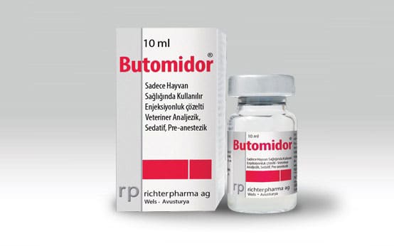 Butomidor 10 mg/ml Enjeksiyonluk çözelti Veteriner Analjezik, Sedatif, Pre-anestezik BİLEŞİMİ: Her ml’de 10 mg Butorfanol’a eşdeğer 14,58 g Butorfanol hidrojen tartarat içeren renksiz ve berrak bir çözeltidir. Diğer bileşenler: Benzetonyum klorür 0.1 mg, Sodyum klorür, Enjeksiyonluk su FARMAKOLOJİK ÖZELLİKLER: Farmakoterapötik grup: Morfinan türevleri; ATCvet kodu:QN02AF01 Farmakodinamik özellikler: Butorfanolün sentetik opioidler grubundan santral etkili bir analjeziktir. Hem agonist hem de antagonist etkisi mevcuttur. Kappa opioid reseptör alt tipine karşı agonist, mu reseptör alt tipine karşı ise antagonist etkilidir. Kappa reseptörleri analjezi, kardiyo vaskuler sistemin depresyonsuz sedasyonu ve vücut ısısını kontrol eder, oysa mu reseptörleri supraspinal analjezi, kardiyopulmoner sistemin sedasyonu ve depresyonunu ve vücut ısısını kontrol eder. Butorfanolün agonist bileşen aktivitesi antagonist bileşenden on kat daha güçlüdür. Analjezi genel olarak at, köpek ve kedide uygulamayı takiben 15 dakika içinde oluşur. Atlarda tek bir damar içi dozdan sonra analjezik etki genellikle 2 saat kadar sürer. Köpeklerde tek bir damar içi uygulamadan sonra 30 dakika kadar etki devam eder. İç organ ağrısı olan kedilerde analjezik etki 6 saate kadar kanıtlanmıştır. Somatik ağrısı olan kedilerde analjezik etki süresi oldukça kısa olmuştur. Doz artışı ile analjezik etki artışı birbiri ile ilişkili değildir, yaklaşık 0.4 mg/kg’lık bir doz pik etki yapar. Butorfanol hedef türlerde çok az kardiyopulmoner depresan etkiye sahiptir. Atlarda histamin salınımına neden olmaz. α2 – agonistler ile kombinasyonu additif ve sinerjistik sedasyona neden olur. Farmakokinetik özellikler: Ürünün parenteral uygulama sonrası absorpsiyonu hızlıdır ve neredeyse 0.5 -1.5 saat sonra serum pik seviyesine ulaşır. Yüksek oranda plazma proteinlerine bağlanır (% 80’e kadar). Dağılım hacmi damar içi uygulama sonrası dokularda önerilen geniş dağılım hacminden (atlar için 2.1 L/kg, köpekler için 4.4 L/kg ve kediler için 7.4 L/kg) daha büyüktür. Metabolizma hızlıdır ve başlıca karaciğerde metabolize olur. İki inaktif metabolit oluşur. Son yarılanma ömrü: atlarda yaklaşık 44 dakika, köpekler için 1.7 saat ve kediler için 4.1 saat. Atılım başlıca idrar (büyük çoğunlukla) ve dışkı yoluyla oluşur. Atlarda damar içi uygulamadan sonra dozun % 97’si 5 saatten daha az sürede vücuttan atılır. KULLANIM SAHASI / ENDİKASYONLARI: AT: Bir analjezik olarak Gastrointestinal orijinli kolik benzeri ağrının kısa sürede kesilmesi için kullanılır. Bir sedatif ve pre-anestezik olarak α2 – adrenoseptör agonistleri (detomidin, romifidin, ksilazin) ile kombinasyonda: Ayakta yapılan küçük ameliyat ve kolay kontrol edilemeyen hastaların muayene ve tedavi işlemlerinde sakinleştirici olarak kullanılır. KÖPEK/KEDİ :Bir analjezik olarak ameliyat öncesi ve sonrası veya travma sonrası görülebilen orta şiddette visseral ağrının kesilmesi için kullanılır. Bir sedatif olarak α2 – adrenoseptör agonistleri (medetomidin) ile kombinasyonda. Bir pre-anestezik olarak -Anestezik rejimin parçası (medetomidin, ketamin). HEDEF TÜRLER: At, kedi, köpek KULLANIM ŞEKLİ VE DOZU: At : Damar içi kullanım Köpek : Damar içi, deri altı ve kas içi kullanım Kedi : Damar içi ve deri altı kullanım AT Bir analjezik olarak Tek Basına 0.1 mg/kg ( l ml/100 kg canlı ağırlık) damar içi. Bir sedadif ve pre-anestezik olarak Detomidin ile: Detomidin: 0.012mg/kg damar içi, bunu takiben 5 dakika içinde Butorfanol: 0.025 mg/kg (0.25 ml/100 kg canlı ağırlık) damar içi. Romifidin ile: Romifidin: 0.05 mg/kg damar içi, bunu takiben 5 dakika içinde Butorfanol: 0.02 mg/kg (0.2 ml/ 100 kg canlı ağırlık damar içi. Xvlazin ile Xylazin: 0.5 mg/kg damar içi, bunu takiben 3-5 dakika sonra Butorfanol: 0.05-0,1 mg/kg (0.5-1 ml/ 100 kg canlı ağırlık) damar içi KÖPEK Bir analjezik olarak Tek başına 0,1- 0,4 mg/kg ( 0,01 – 0,04 ml/kg canlı ağırlık) yavaş olarak damar içi (düşükten orta doz aralığında) benzer şekilde kas içi, deri altı. İyileşme süresince ağrının yeterli düzeyde kesilebilmesi için, operasyon sonrası ağrının kontrol edilebilmesi amacıyla anestezinin sonlanmasından 15 dakika önce uygulanmalıdır. Bir sedatif olarak Medetomidin ile: Butorfanol : 0.1 mg/kg (0.01 ml/kg canlı ağırlık) damar içi, kas içi Medetomidin : 0.01 mg/kg damar içi, kas içi Bir pre-anestezik olarak Medetomidin ve ketamin ile: Butorfanol : 0.1 mg/’kg {0.01 ml/kg canlı ağırlık) kas içi Medetomidin : 0.025 mg/kg kas içi bunu takiben 15 dakika içinde Ketamin : 5 mg/kg kas içi Sadece ketaminin etkisi ortadan kalktığında medetomidinin etkisini önlemek için vücut ağırlık başına 0.1 mg/kg atipamezol kullanılmalıdır. KEDİ Bir analjezik olarak Tek Başına Ameliyat sonrası anestezinin sonlanmasından 15 dakika önce ya: 0.4 mg/kg (0.04 ml/kg canlı ağırlık) derialtı ya da: 0.1 mg/kg (0.01 ml/kg canlı ağırlık) damar içi Bir sedatif olarak Medetomidin ile: Butorfanol : 0.4 mg/kg (0.04 ml/kg canlı ağırlık) derialtı Medetomidin : 0.05 mg/kg derialtı Yaranın temizlenmesinde ilave bir lokal anestezi önerilir. Medetomidinin etkisini, 0.125 mg/kg canlı ağırlık dozunda atipamezol kullanarak önlemek mümkündür. Bir pre-anestetik olarak Medetomidin ve ketamin ile: Butorfanol : 0.1 mg/kg (0.01 ml/kg canlı ağırlık) damar içi Medetomidin : 0.04 mg/kg damar içi Ketamin : 1.5 mg/kg damar içi Sadece ketaminin etkisi ortadan kalktığında medetomidinin etkisini önlemek için vücut ağırlık başına 0.1 mg/kg atipamezol kullanılmalıdır. ÖZEL KLİNİK BİLGİLER VE HEDEF TÜRLER İÇİN UYARILAR: Butorfanol kısa süreli (at ve köpek) ve kısa ile orta süreli bir (kedi) analjezinin gerekli olduğu durumlarda kullanılm