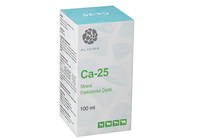 Ca-25 Enjeksiyonluk Çözelti Bileşimi: Renksiz-sarımsı renkli berrak steril çözelti her ml’sinde; Kullanım Sahası: Sığır, at, koyun ve keçilerde kalsiyum ve magnezyum eksikliklerinde, hipokalsemi, laktasyon tetanisi, hipomagnezemik tetani, seyahat ve çayır tetanilerinde, raşitizm ve osteomalasi hallerinde, alerjiler, zehirlenmeler ve zehirli hayvan sokmalarında kullanılır. Ticari Takdim Şekli: 100 ml ve 250 ml’lik renksiz cam şişelerde karton kutu içerisinde, 500 ml ve 1 L’lik renksiz cam şişelerde strafor ambalaj içerisinde satışa sunulmaktadır. |
