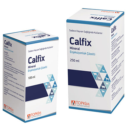 BİLEŞİMİ: Açık sarı renkli berrak çözeltinin her 1 ml'si; Kalsiyum glukonat 450 mg Magnezyum klorit 75 mg içerir. FARMAKOLOJİK ÖZELLİKLERİ: Calfix kalsiyum ve magnezyumun çözelti halinde hazırlanmış kombinasyonudur. Uygulamadan kısa bir süre sonra bu minerallerin kandaki seviyesi yükselir. Kalsiyum glukonat deri altı verildiğinde yavaş emilir ve uzun süreli kalsiyum kaynağını oluşturur. Enjeksiyondan sonra vücut dokularına yayılan kalsiyum hücre dışı sıvılara girer ve hızla kemik dokusu ve dişlere katılır. Vücutta bulunan kalsiyumun %99 ' u kemiklerde yer alır. Kalsiyumun metabolizması sırasında böbreklere ulaşan miktarın %90' ı renal tübüllerde yeniden emilir. Magnezyum hücre içi sıvıdaki en çok bulunan katyonlardan biridir. Özellikle fosfotransferaz enziminde kofaktör olarak görev alarak hücre içi parçacıkların bir araya getirilmesinde ve makromoleküllerin ribozomlara ve mRNA'ya bağlanmasında önemli rol oynar. Magnezyum, nörokimyasal iletimde ve kasların uyarılmasındaki görevi ile merkezi sinir sistemi ve kalp- damar sistemi için önem taşır. Alınan miktarın önemli bir kısmı atılmak üzere böbreklere ulaştığında proksimal tübüllerden geri emilir. KULLANIM SAHASI: Sığır, at, koyun ve keçilerde kalsiyum ve magnezyum eksikliklerinde ve kalsiyum magnezyum desteğine ihtiyaç duyulan durumlarda;