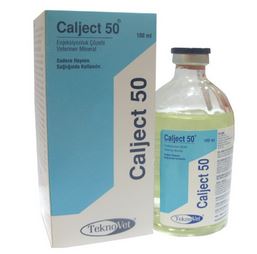 BİLEŞİMİ Açık sarı renkli berrak bir çözelti olan Calject 50 Enjeksiyonluk Çözelti’nin her 100 ml’si ; Kalsiyum glukonat .................................... 45 g 100 ml Calject 50 Enjeksiyonluk Çözelti 5 g elementsel kalsiyum içerir. KULLANIM YERİ /ENDİKASYONLARI Calject 50 Enjeksiyonluk Çözelti; sığır, at, koyun ve keçilerde başlıca kalsiyum, magnezyum ve fosfor eksikliğinin neden olduğu hastalıkların tedavisi ve korunmasında kullanılır.
