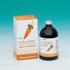 BİLEŞİMİ Carofertin® enjeksiyonluk çözelti koyu kırmızı renkte berrak aköz bir çözelti olup, 1 mi' sinin bileşiminde 10 mg Betakaroten etkin maddesi mevcuttur. KULLANIM SAHASI / ENDİKASYONLAR İnek, kısrak ve anaç domuzlarda betakaroten noksanlığından kaynaklanan dölerme bozukluklarının sağaltımı ve önlenmesi, dölerme performansının yükseltilmesi, corpus luteum'un stabilizasyonu, progesteron seviyesinin yükseltilmesi, döllenmiş yumurtanın uterus mukozasına normal şekilde yerleşmesine destek, gebeliğin korunması, post puerperal hastalıklara karşı direncin artırılması amaçlarıyla kullanılır. UYGULAMA ŞEKLİ VE DOZU Kas içi veya deri altı enjeksiyon şeklinde uygulanır. Farmakolojik etkin dozu, vücut ağırlığına bakılmaksızın, ineklerde 200 - 250 mg, kısraklarda 200 mg, domuzlarda 70 mg betakaroten eşdeğeridir. Pratik uygulama dozlan :
