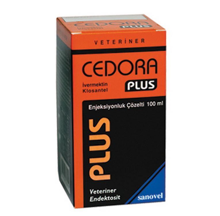 CEDORA PLUS BİLEŞİMİ CEDORA PLUS Enjeksiyonluk Çözelti, sarı, berrak, homojen, steril bir çözelti olup ml’sinde 10 mg ivermektin ve 125 mg klosantel içerir. FARMAKOLOJİK ÖZELLİKLERİ CEDORA PLUS Enjeksiyonluk Çözelti’nin bileşiminde bulunan ivermektin en az %80 oranında 22,23-dihydroavermectin B1a ve en fazla %20 oranında 22,23 dihydroivermectin B1b kimyasal bileşime sahiptir. Streptomyces avermitilis’in fermantasyonu yoluyla izole edilen avermektinlerden derive edilen ivermektin, yapısal olarak makrolid antibiyotiklere benzeyen, ancak kayda değer antimikrobiyel etkileri bulunmayan geniş spektrumlu bir endektosittir. İvermektin, nematod parazitlerin motorik ganglion sinapslarında ve artropod parazitlerin nöromuskuler son plaklarında (artropodlar) gama amino butirik asit (GABA) salgısını artırmak suretiyle klor (CI-) kanallarını açık tutarak motorik sinir impulslarının geçişini engeller, parazit felç olur ve ölür. Buna karşılık, ivermektin memeli hayvanlarda kan/beyin bariyerini aşıp merkezi sinir sistemi içinde yer alan GABA-erjik sinirlere yeterince nüfuz edemediği için, konak hayvana zarar vermeksizin parazitleri öldürür. İvermektin deri altı uygulamada maksimum plazma konsantrasyonuna erişme zamanı ortalama 1,3 gün, plazma eliminasyon yarı ömrü koyunlarda ortalama 3,5 gün, sığırlarda 8 gündür. İvermektin plazma proteinlerine bağlanır ve dağılım hacmi yüksektir. Beyin-omurilik sıvısı hariç bütün dokulara ve vücut sıvılarına nüfuz eder. Yağ dokularında depolanarak yavaş yavaş salındığı ve vücuttan elimine edildiği için parazit türlerine bağlı olarak 2 ila 4 hafta arasında değişen sürelerde etkisini devam ettirir. Başlıca safra ile ve çok düşük oranda da idrarla atılır. Atılan maddenin %90’dan fazlası metabolize olmamış ivermektin ana bileşiğidir. Klosantel, N-[5-chloro-4-[(4-chlorophenyl)cyanomethyl]-2-methylphenyl]-2-hydroxy- 3,5-diiodobenzamide kimyasal yapısında geniş spektrumlu bir salisilanilid (iyodobenzamid) türevi antihelmintiktir. Etkisi özellikle trematodlar üzerine yoğunlaşmakla birlikte, kan emen yuvarlak kurtlar ve bazı parazit sinek larvalarına karşı da etkilidir. Klosantel bir hidrojen iyonoforudur. Lipofilik yapısı sayesinde hücresel membranları geçerek mitokondrilere kadar ulaşır ve enzimatik sistemde oksidatif fosforilazı parçalayıcı olarak işlev görür. Klosantel oral uygulamada 24 saat ve deri altı uygulamada 48 saate yakın sürede plazma pik seviyesine ulaşır. Klosantel’in plazma yarı ömrü 15 gün dolayındadır. Bu nedenle oldukça uzun etkili bir ilaç olarak değerlendirilir. Klosantel düşük oranda metabolize olur ve %90 oranında değişmemiş olarak dışkı ve idrar yoluyla atılır. ÖZEL KLİNİK BİLGİLER VE HEDEF TÜRLER İÇİN UYARILAR