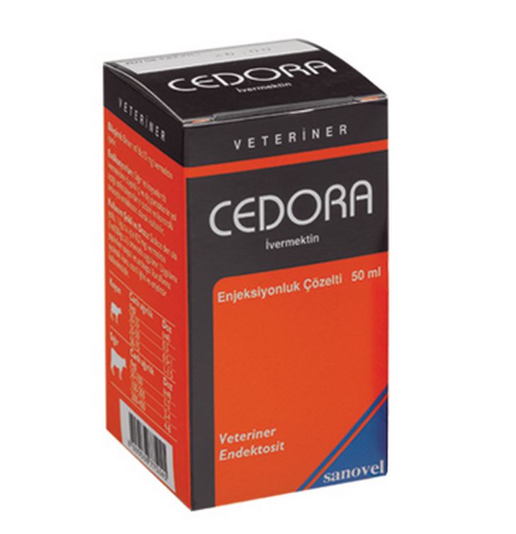 CEDORA BİLEŞİMİ CEDORA Enjeksiyonluk Çözelti, renksiz veya hafif sarı, berrak, homojen, steril bir çözelti olup ml’sinde 10 mg ivermektin içerir. FARMAKOLOJİK ÖZELLİKLERİ CEDORA Enjeksiyonluk Çözelti’nin bileşiminde bulunan ivermektin, en az %80 oranında 22,23-dihydroavermectin B1a ve en fazla %20 oranında 22,23 dihydroivermectin B1b kimyasal bileşime sahiptir. Streptomyces avermitilis’in fermantasyonu yoluyla izole edilen avermektinlerden derive edilen ivermektin, yapısal olarak makrolid antibiyotiklere benzeyen, ancak kayda değer antimikrobiyel etkileri bulunmayan geniş spektrumlu bir endektosittir. İvermektin, nematod parazitlerin motorik ganglion sinapslarında ve artropod parazitlerin nöromuskuler son plaklarında gama amino butirik asit (GABA) salgısını artırmak suretiyle klor (CI-) kanallarını açık tutarak motorik sinir impulslarının geçişini engeller, parazit felç olur ve ölür. Buna karşılık, ivermektin memeli hayvanlarda kan/beyin bariyerini aşıp merkezi sinir sistemi içinde yer alan GABA-erjik sinirlere yeterince nüfuz edemediği için, konak hayvana zarar vermeksizin parazitleri öldürür. Deri altı uygulamada maksimum plazma konsantrasyonuna erişme zamanı ortalama 1,3 gün, plazma eliminasyon yarı ömrü koyunlarda ortalama 3,5 gün, sığırlarda 8 gündür. İvermektin plazma proteinlerine bağlanır ve dağılım hacmi yüksektir. Beyinomurilik sıvısı hariç bütün dokulara ve vücut sıvılarına nüfuz eder. Yağ dokularında depolanarak yavaş yavaş salındığı ve vücuttan elimine edildiği için parazit türlerine bağlı olarak 2 ila 4 hafta arasında değişen oranlarda etkisini devam ettirir. Başlıca safra ile ve çok düşük oranda da idrarla atılır. Atılan maddenin %90’dan fazlası metabolize olmamış ivermektin ana bileşiğidir. ÖZEL KLİNİK BİLGİLER VE HEDEF TÜRLER İÇİN UYARILAR