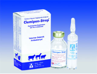 FARMAKOLOJİK ÖZELLİKLERİ Clemipen®-Strep, penisilin ve streptomisine duyarlı bakterilerden ileri gelen enfeksiyonların tedavisinde kullanılmaya mahsus, geniş spektrumlu, bakterisidal etkili ve sinerjistik nitelikte bir kombinasyondur. Penisilin bakteri hücre duvarı sentezini, streptomisin ise, bakteri ribozomlannda protein sentezini durdurmak suretiyle bakterisit etki gösterir. Penisilin etkisiyle hücre duvarı geçirgenliğinin artması streptomisinin bakteri hücresi içine nüfuz etmesini kolaylaştırır. Bu kombinasyon hayvanlarda rastlanan çeşitli bakteriyel enfeksiyonların belli başh etkenlerinden olan Streptococcus sp., Staphylococcus sp., Corynebacterium sp., Clostridium sp., Actinobacillus sp., Erysipelothrix irısidosa, Listeria sp., Leptospira sp., Bacillus anthracis, Haemophylus sp., E. coli, Klebsiella sp., Pasteurella hemolytica, Pasteurella multocida, Actinobacillus lignierensi, gibi çoksayıda gram pozitif ve gram negatif bakteriyi kapsayan geniş antibakteriyel etkinliğe sahiptir. Benzilpenisilin klemizol kas içi enjeksiyonu takip eden 4-6 saat içinde pik plazma konsantrasyonuna ulaşır, duyarlı bakterilere etkin olan plazma ve doku konsantrasyonları 24 saatten uzun süre devam eder. Streptomisin 1-1.5 saat içinde terapötik konsantrasyona erişir ve hızla dokulara dağılır. Penisilin safra salgısı ve idrarla, streptomisin idrar yolu ile vücuttan atılır. ÖZEL KLİNİK BİLGİLER VE HEDEF TÜRLER İÇİN UYARI Benzilpenisilin klemizol uygulanan hayvanlarda plazma ve hedef dokularda lokalize olan bakterilere etkin seviyelerdeki benzilpenisilin konsantrasyonları 36 saate kadar ve hatta daha uzun süre devam eder. Uygulama 24 saatte bir tekrarlandığı için, tedavi süresince terapötik etkinliğin kesintisiz devamı sağlanabilir. Klemizolün spesifik olmayan antihistaminik etkisi de vardır. Tavsiye edilen dozların altında kullanılmamalıdır. İhtiyaç duyulduğunda veteriner hekimin takdirine göre doz yükseltilebilir. Yapılan çalışmalarda, Streptomisin ve dihidrostreptomisinin fare, tavşan, ve kobaylarda teratojenik etkisinin olmadığı gösterilmiştir. Her iki etkin maddenin sperm kalitesi reproduktif verim ve gebelikte yavru gelişimi üzerinde bir yan etkisine rastlanmamıştır. İSTENMEYEN YAN ETKİLER Bazı duyarlı hayvanlarda beta laktam antibiyotiklere has aşırı duyarlılık reaksiyonları: ürtiker, bulantı, kusma, solunum güçlüğü, anjiyonörotik ödem, vasomotor merkezi felci ve koma gibi yan etkiler, anaflaktik şok ve ölüm görülebilir. Beta laktam antibiyotiklere hassas olduğu bilinen hayvanlara uygulanmamalıdır. Böbrek fonksiyon bozukluğu olan hayvanlarda, doza bağh olarak oluşan yüksek streptomisin plazma konsantrasyonları nörotoksik, nefrotoksik ve ototoksik etki gösterebilir. Böbrek yetmezliklerinde doz miktarı iyi ayarlanmalıdır. İLAÇ ETKİLEŞİMLERİ Bakteriostatik etkili antibiyotiklerle (tetrasiklinler, sulfonamidler) beraber kullanılmamalıdır. Antipiretik ve antiromatizmal ilaçlarla (özellikle fenilbutozon ve salisilatlar) birlikte kullanıldığında penisilinin böbrekten atılımı yavaşlayabilir. Streptomisinin muhtemel toksik etkilerinden dolayı, nefrotoksik, ototoksik ve nörotoksik olduğu bilinen ve/veya streptomisinin bu etkilerini arttırabilecek diğer ilaçlar ile (diğer aminoglikozidler, furosemid, sulfonamidler, tetrasiklinler, anestezikler, sefalosporinler vb) birlikte kullanılmamalıdır. Özellikle yüksek dozlarda olmak üzere, penisilin-streptomisin kombinasyonlarının genel anestezi ve/veya kas gevşetici uygulanmış hayvanlarda kullanılmasının blokaj etkiyi arttırıp ölümlere neden olabileceği de unutulmamalıdır. DOZ AŞIMINDA BELİRTİLER, TEDBİRLER,ANTİDOT Çok yüksek dozlar ve uzun süre kullanımlarda streptomisinden kaynaklanan denge bozukluğu, sağırlık ve üriner sistem semptomları ortaya çıkabilir. Bu durumda tedavi durdurulur. GIDALARDA İLAÇ KALINTI UYARILARI İlaç kalıntı arınma süresi (İJî^js.): Tedavi süresince ve son üaç uygulamasından sonra, sığır ve koyunlar 14 gün geçmeden kesime gönderilmemelidir. Tedavi süresince ve son uygulamayı takiben 4 gün (8 sağım) geçmedikçe koyun ve sığır sütü insan tüketimine sunulmamalıdır. KONTRAENDİKASYONLARI Penisilin ve sefalosporinlere allerjik olduğu bilinen ve karaciğer ve böbrek yetmezliği olan hayvanlarda kullanılmamalıdır. Kediler streptomisine daha duyarlı olduklan için streptomisin ihtiva eden ilaçlar kedilerde kullanılmamalıdır. HEDEF OLMAYAN TÜRLER İÇİN UYARI Bütün diğer penisilin içeren ürünlerde olduğu gibi oral ya da patenterai yolla kullanımı tavşan, kobay, hamster gibi küçük laboratuar hayvanlarında ve kaz, ördek gibi perde ayaklılarda gastro-intestinal florayı bozabileceğinden bu hayvanlarda kullanılmamalıdır. GENEL UYARILAR Kullanmadan önce ve beklenmeyen etki görüldüğünde veteriner hekime danışınız. Çocukların ulaşamıyacağı yerlerde bulundurunuz. UYGULAYICILARIN ALMASI GEREKEN ÖNLEMLER VE HEKİMLER İÇİN UYARI Penisiline aşırı duyarlılığı olan kişiler ilaca hiçbir şekilde temas etmemelidir. Duyarlı kişilerin ilaçla deri, ağız veya inhalasyon yolu ile teması sonucu yüz, göz ve dudaklarda şişme, nefes almada zorluk gibi belirtilerin meydana gelmesi halinde acil tıbbi müdahele gerekir. İlaç ve etiketi ile beraber derhal doktora başvurulmalıdır. MUHAFAZA ŞARTLARI VE RAF ÖMRÜ Doğrudan güneş ışığı almayan yerde, orijinal ambalajında 15- 25 °C arasındaki oda ısısında muhafaza ediniz. Raf ömrü : imal tarihinden itibaren 3 yıldır. Enjeksiyon için hazırlanıp bir bölümü kullanıldıktan sonra arta kalan süspansiyon, asepsi şartlarına uymak ve buz dolabında + 2 °C ile + 8 °C ısıda kendi ambalajı içinde muhafaza edilmek şartıyla 7 gün süreyle etkinliğini korur. TİCARİ TAKDİM ŞEKLİ 20 mi renksiz cam flakon