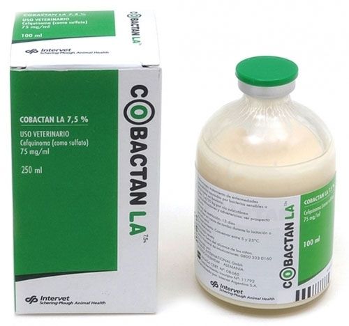 Bileşimi :Beher ml’de 75 mg Sefkuinom (sülfat olarak) içeren beyaz veya kirli beyaz renkli süspansiyon. Endikasyonları: Sığırlarda başta Pasteurella haemolytica, Pasteurella multocida ve Histophilus somni olmak üzere, sefkuinom’a duyarlı bakterilerin neden olduğu solunum sistemi hastalıklarının tedavisinde kullanılır. Kullanım şekli ve dozu: Veteriner hekim tarafından başka bir şekilde tavsiye edilmediği takdirde, COBACTAN LA %7.5, 2.5 mg sefkuinom/kg canlı ağırlık dozunda deri altı olarak uygulanır. Pratik doz olarak, 30 kg canlı ağırlığa 1 ml kullanılır. İlk enjeksiyonu takiben 48 saat boyunca oluşan yanıt değerlendirilir. Eğer hastalığın klinik bulgusu devam ediyorsa 48 saat sonra ikinci bir enjeksiyon yapılması tavsiye edilmektedir. Doğru dozajı sağlamak ve olası düşük dozdan kaçınmak için canlı ağırlık mümkün olduğunca doğru bir şekilde saptanmalıdır. Bir bölgeye 10 ml’den fazla enjekte edilmemesi için dozun bölünmesi önerilir. Kullanmadan önce şişe çalkalanmalıdır.