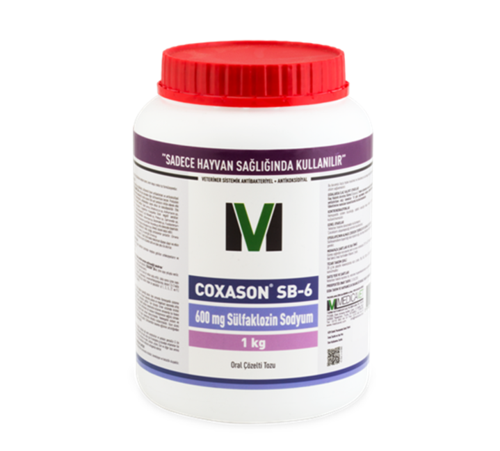 Bileşimi: Farmakolojik Özellikleri: COXASON SB-6, etki tarzı yönünden diğer sülfonamitlere benzer. Protozoon ve bakteri metabolizmasında paraamino benzoikasit’in yerini alarak folik asit sentezini inhibe ederek etki eder. Antibakteriyel olarak etkisi bakteriyostatik, antikoksidiyal olarak etkisi de koksidiyositdir. Etki spektrumuna giren bakteriler: Gram pozitif aeroblar: Staph, aureus, Streptococcus sp., Actinomyces sp., Corynebacterium sp., Listeria monocytogenes, Erysipelothrix rhusiopathie. Gram negatif aeroblar: Actinobacillus sp., Bordetella sp., Enterobacteriaceae (E. coli, Klebsiella sp., Proteus sp., Salmonella sp., Yersinia sp.) Haemophilus sp., Pasteurella sp. Anaeroblar : Actinomyces sp., Bacteroides sp., Fusobacterium sp., bazı Clostridium sp., Chlamydia sp. Bazı Mycobacterium sp. ve bazı Nocardia sp. orta derecede duyarlıdır. Rickettsia sp., Leptospira sp., Pseudomanas aeruginosa, Mycoplasma sp. dirençli olarak kabul edilir. COXASON SB-6’nın etken maddesi olan sülfaklozin’in etkili olduğu protozoonlar şunlardır: Eimeria türleri, E. tenella, E. necatrix, E. acervullina, E. maxima, E. brunetti, Eimeria sp. İçme suyu ile verildiğinde hızla emilerek ortalama 1-3 saat içinde kanda maksimum düzeye ulaşır ve etkin yoğunluğunu 12 saat süreyle korur. Böbreklerden ve sınırlı ölçülerde safra ve dışkı yolu ile atılırlar. Endikasyonları: |