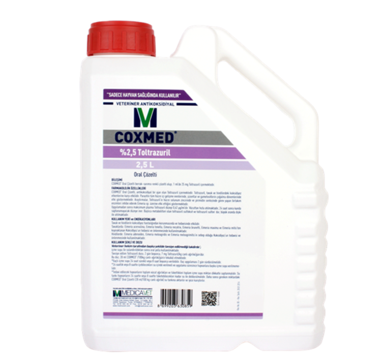 Bileşimi: Farmakolojik Özellikleri: Uygulamadan sonra maksimum plazma Toltrazuril düzeyi 0,62 µg/ml’dir. Vücuttan hızla atılmaktadır, 24 saat sonra kanda saptanamayacak düzeye iner. Başlıca metabolitleri olan toltrazuril sulfoksit ve toltrazuril sulfon, büyük oranda dışkı ile atılmaktadır. Endikasyonları: Tavuklarda: Eimeria acervulina, Eimeria tenella, Eimeria necatrix, Eimeria brunetti, Eimeria maxima ve Eimeria mitis’ten kaynaklanan Koksidiyoz’un tedavisi ve önlenmesinde kullanılmaktadır. Hindilerde: Eimeria adenoides, Eimeria meleagridis ve Eimeria meleagrimitis’in sebep olduğu Koksidiyoz’un tedavisi ve önlenmesinde kullanılmaktadır. Ambalaj: 100 ml, 500 ml, 1 Litre, 2.5 Litre ve 5 Litre |