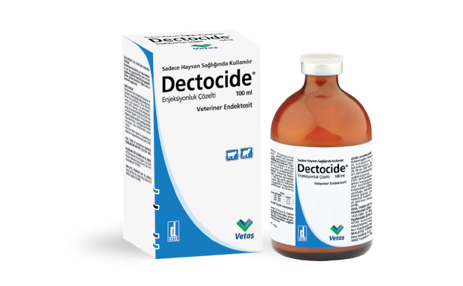 Sadece Hayvan Sağlığında Kullanılır BİLEŞİMİ DECTOCİDE Enjeksiyonluk Çözelti; renksizden açık sarıya kadar değişen renkte bir çözeltidir. Beher ml’de etkin madde olarak 10 mg Doramektin ve yardımcı madde olarak benzil alkol içerir. FARMAKOLOJİK ÖZELLİKLERİ Farmakoterapötik grubu: Endektosit Farmakodinamik özellikleri Doramektin fermentasyon ile türetilmiş bir antiparazitik madde olup avermektin sınıfına mensuptur ve yapısal olarak ivermektinlerle yakından ilişkilidir. Her iki bileşikte geniş spektrumlu antiparazitik etki gösterir ve nematodlar ile parazitik artropodlarda benzer paraliz etkisi oluşturur. Avermektinlere tek bir aksiyon modu belirlemek mümkün olmasa da, serinin tümünün ortak bir mekanizmayı paylaşması mümkündür. Parazitik organizmalarda etki, spesifik bir avermektin bağlanma bölgesi aracılığıyla olur. Avermektin bağlanmasına fizyolojik yanıt, klorür iyonlarına karşı membran geçirgenliğinin artmasıdır. Omurgasızların sinir dokusunda nematodların eksitator motor sinirlere veya artropodların kas hücrelerine klorür iyonlarının akışı; hiperpolarizasyon ve paralizle sonuçlanan uyarı iletiminin eliminasyonuna neden olur. Doramektin, reseptör/kanal kompleksleri MSS’de yerleşmiş olan memelilerde son derece iyi tolere edilir. Avermektinler gibi yüksek molekül ağırlığına sahip ürünlerin zayıf penetrasyon özelliği, nörolojik fonksiyonlara etki etmeden önce yüksek sistemik konsantrasyon gerektiğini gösterir. Farmakokinetik özellikler Sığırlarda Dectocide Çözelti’nin subkutan uygulamadan 3 gün sonra Doramektin maksimum plazma konsantrasyonu görülür. Koyunlarda Dectocide Enjeksiyonluk Çözelti’nin intramusküler veya subkutan uygulamasından 2 gün sonra Doramektin maksimum plazma konsantrasyonu görülür. Subkutan uygulamadan sonra sığırlarda 6 gün ve koyunlarda 4.5 gün eliminasyon yarı ömrü görülür. İntramusküler veya subkutan uygulamayı takiben, koyunları ve sığırları parazitik enfeksiyonlardan ve tedaviyi takiben uzun süre sonra tekrar ortaya çıkmasından koruyan sabit Doramektin konsantrasyonu elde edilir. Doramektin vücuttan büyük oranda safra ve dışkı yoluyla ve çok az miktarlarda da (% 1’den az) idrar yoluyla atılır. KULLANIM SAHASI/ENDİKASYONLAR Dectocide Enjeksiyonluk Çözelti sığır ve koyunlarda aşağıda belirtilen nematod ve artropodlara karşı endikedir. Sığırlarda: Mide-barsak nematodları, akciğer kıl kurtları, göz nematodları, hipodermalar, emici bitler ve uyuz akarlarının kontrolü ve tedavisinde (tedavi ve profilaksi) kullanılmaktadır. Mide-barsak kıl kurtları (erişkin ve dördüncü larva evresinde): Ostertagia ostertagi (inhibe edilmiş larvalar dahil), O. lyrata*, Haemonchus placei, Trichostrongylus axei, T. colubriformis, T. longispicularis, Cooperia oncophora, C. pectinata*, C. punctata, C. surnabada (benzeri. mcmasteri), N. spathiger*, Bunostomum phlebotomum*, Strongyloides papillosus*, Oesophagostomum radiatum, Trichuris spp.* *erişkinler Akciğer kıl kurtları: (erişkin ve dördüncü larva evresinde) Dictyocaulus viviparus Göz nematodları: (erişkinler) Thelazia spp. Hipoderma’lar: (parazitik larval evreler L1-L2-L3) Hypoderma bovis, H. lineatum Emici bitler: Haematopinus eurystemus, Linognathus vituli, Solenopotes capillatus Uyuz akarları: Psoroptes bovis, Sarcoptes scabiei DECTOCİDE Enjeksiyonluk Çözelti aynı zamanda Nematodirus helvetianus kontrolünde, ısırıcı bit (Damalinia bovis) ve Chorioptes bovis uyuz akarı kontrol altına alınmasında yardımcı olarak kullanılabilir. DECTOCİDE Enjeksiyonluk Çözelti’nin farmakokinetik özellikleri sığırları aşağıdaki parazit enfeksiyonları ve tekrarlı enfeksiyonlarından belirtilen dönemler içerisinde korur. Tür Gün Bunostomum phlebotomum 22 Cooperia oncophora 21 Dictyocaulus viviparus 35 Haemonchus placei (yalnız erişkin) 28 Linognathus vituli 28 Oesophagostomum radiatum 21 Ostertagia ostertagi 35 Psoroptes bovis 42 Trichostrongylus axei 28 DECTOCİDE Enjeksiyonluk Çözelti’nin etkilerinden optimum yarar sağlamak için, sığırlar meraya ilk çıkışta ve 8 hafta sonra tekrar tedavi edilmelidir. Dectocide Enjeksiyonluk Çözelti’nin bu şekilde kullanımı merada enfektif larvaların gelişmesini azaltacak ve mera sezonu boyunca hayvanları paraziter gastroenterit ve paraziter bronşitlerden koruyacaktır. Bu sonuçları elde etmek için tüm hayvanlar programa dahil edilmeli ve tedavi edilmemiş sığırlar meraya çıkarılmamalıdır. DECTOCİDE Enjeksiyonluk Çözelti ile mera sezonunda sığırların meraya ilk çıkışta ve 8 hafta sonrasında tedavisi, akciğer kıl kurtlarının sebep olduğu klinik hastalıklara karşı korur ve kazanılmış bağışıklığın doğal olarak gelişmesine izin verir. Ancak sezon uzun ise, akciğer kıl kurtlarının tahmin edilemeyen epidemiyolojilerinden dolayı akciğer kıl kurdu hastalığı belirtileri bazen, özellikle mera sezonu sonuna doğru görülebilir. Bu durumda sığırlar yeniden akciğer kurtlarına karşı bir antelmintik ile tedavi edilmelidir. Koyunlarda: Mide-barsak kıl kurtları, uyuz akarları ve nazal miyazis etkeni Oestrus ovis’in kontrolü ve tedavisinde kullanılmaktadır. Mide-barsak kıl kurtları (başka şekilde belirtilmedikçe erişkin ve 4. Larva evresi). Bunostomum trigonocephalum (yalnızca erişkin), Chabertia ovina, Cooperia curticei (yalnızca L4), C. oncophora, C. pectinata, C. punctata, C. spatulata, Gaigeria pachyscelis, Haemonchus contortus, H. similis, Nematodirus battus (yalnızca L4 ), N. filicollis (yalnızca erişkin), N. spathiger, Ostertagia (Teladorsagia) circumcincta*, Ostertagia (Teladorsagia) trifurcata (yalnızca erişkin), Oesophagostomum venulosum (yalnızca erişkin), O. columbianum, Strongyloides papillosus, Trichostrongylus axei, T. colubriformis, T. longispicularis, T. vitrinus, Trichuris sp