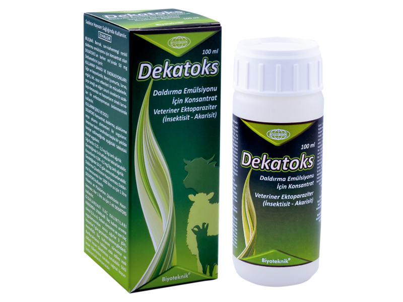 Dekatoks Daldırma Çözeltisi İçin Konsantrat Veteriner Ektoparaziter (İnsektisit-Akarisit) BİLEŞİMİ: Berrak, sarı-kahverengi renkli daldırma emülsiyonu için konsantrat olan DEKATOKS’un beher ml’sinde 50 mg Deltamethrin içerir. FARMAKOLOJİK ÖZELLİKLERİ: Sentetik piretroidlerden deltamethrin ihtiva eden DEKATOKS Konsantrat kene, bit, sinek gibi duyarlı ektoparazitlerin yumurta, larva ve ergin hallerine etkilidir. Deltamethrin de diğer sentetik piretroidler gibi temas ve mide zehiri olarak etkisini göstermektedir. Sistemik bir etkisi yoktur. Hedef ektoparazitlerin nöronlarında sinirsel ileti sırasında sodyum geçirgenliğinin uzamasına sebep olarak parazitlerin üzerinde toksik etkisini gösterir. Deltamethrin lipofilik özelliğinde olduğundan insektlerin lipoid moleküllerince zengin kutikulasından kolayca geçerek etki noktalarına ulaşır. Parazitlerin zehirlenmesi neticesinde eksitasyon, hareketlerde inkoordinasyon, paraliz, dehidratasyon ve ölüm görülür. Hayvanlara haricen uygulandığında güvenlidir. Memelilerdeki toksisitesi çok düşüktür. Deltamethrin lipofilik karakterde bir madde olduğundan uygulama sonrası yağmurdan etkilenmez. Deltamethrin deri yolu ile uygulamasından sonra çok az emilir ve hedef parazitte etkisini devam ettirir. Emilen Deltamethrinin büyük bir kısmı dışkı ile, az bir kısmı ise idrarla vücuttan atılır. Deriden az emildiğinden kalıntı seviyeleri minimum limitlerin altındadır. KULLANIM SAHASI VE ENDİKASYONLARI: Sığır ve koyunlarda; Kene (yumurta, larva, ergin), bit, uyuz etkenleri ile mücadelede, çeçe sineği ve diğer zararlı sineklerin uzaklaştırılmasında ve hayvanların sinek larvaları ile enfestasyonunun önlenmesinde kullanılır. KULLANIM ŞEKLİ VE DOZU: DEKATOKS Konsantrat, daldırma, püskürme veya yıkama yöntemleri ile uygulanır. Veteriner hekim tarafından başka bir şekilde tavsiye edilmediğinde aşağıdaki tablodaki dozlar uygulanır. Sığırlarda0,25-1,5 mg/kg Canlı ağırlık Gerektiğinde 3-6 haftada bir tekrarlanabilir.Koyunlarda0,94-4,5 mg/kg Canlı ağırlık Gerektiğinde 10-21 gün sonra tekrarlanabilir.Daldırma Çözeltisinin Hazırlanması; Daldırma havuzunda her 1000 litre su için 1 litre DEKATOKS kullanılır. Yıkama ve Püskürtme Çözeltisinin Hazırlanması; Her 1 litre su için 1 ml DEKATOKS kullanılır. ÖZEL KLİNİK BİLGİLER VE HEDEF TÜRLER İÇİN UYARILAR: Günün sıcak saatlerinde banyo yaptırılması tavsiye edilmemektedir. Banyo yaptırılmadan evvel hayvanların tüyleri fırçalanarak olası döküntülerden arındırılır. Parazitlerin yaygın ve enfestasyonun yoğun olan bölgelerde her hayvan için en az 3 litre yıkama emülsiyonu uygulamak gerekir. Spesifik bir antidotu bulunmamaktadır. Gebelikte kullanımına ilişkin bir komplikasyon bildirilmemektedir. İLAÇ ETKİLEŞİMLERİ: Organik fosforlu insektisitlerle karıştırılmamalıdır. İSTENMEYEN YAN ETKİLER: Bazı sığırlarda hafif huzursuzluk belirtileri gözlenebilir, bunun yanı sıra kızarma ve kaşıntı gibi çok hafif seyreden deri hassasiyetleri meydana gelebileceği bildirilmiştir. DOZ AŞIMINDA BELİRTİLER, TEDBİRLER: Deltametrinin, deri yolu ile uygulamada toksisitesi düşüktür. Kazara çok yüksek dozda ilaç kullanımı sonrasında doz aşımı durumunda hayvanlarda uyuşukluk, kaşıntı, yanma hissi, koordinasyon bozukluğu, felç görülebilir. İlaç kullanımı sonrası benzer belirtiler görüldüğünde veteriner hekime başvurulmalıdır. Klinik bulgular için semptomatik tedavi uygulanmalıdır. Bilinen herhangi bir antidotu bulunmamaktadır. GIDALARDAKİ İLAÇ KALINTILARI HAKKINDA UYARILAR: İlaç kalıntı arınma süresi (i.k.a.s): Tedavi süresince ve son ilaç uygulamasından sonra sığırlar 3 gün, koyunlar 7 gün geçmeden kesime gönderilmemelidir. İlaç kullanım süresince ve durdurulmasını takiben elde edilen inek sütleri insan tüketimine sunulabilir. Sütü insan tüketimine sunulan sağmal koyunlarda ise kullanılmamalıdır. KONTRENDİKASYONLARI: Aktif maddeye hassasiyeti olan hayvanlara ve 7 günlükten küçük buzağılara, 4 haftalıktan küçük kuzulara uygulanmaz. Sağlıklı deri yüzeyi haricinde bir yolla (göz, ağız vs.) uygulanmaz. GENEL UYARILAR: Kullanmadan önce ve beklenmeyen bir etki görüldüğünde veteriner hekime danışınız. Haricen kullanılır. Kullanmadan önce prospektüsü okuyunuz. Çocukların ulaşamayacağı yerlerde muhafaza ediniz. Uygulamadan sonra hayvanların su kaynaklarına girmeleri ve birbirlerini yalamaları engellenmelidir. Hayvanlar yıkandıktan sonra ilaçlama yapınız. UYGULAYICININ ALMASI GEREKEN ÖNLEMLER VE HEKİMLER İÇİN UYARILAR: Temas ve uygulama esnasında koruyucu bir giysi giymeli. Spreyleme esnasında inhalasyon mümkün olduğunca az tutulmalı ve yüz maskesi kullanılmalıdır. Uygulama esnasında yemekten, içmekten ve sigara kullanılmasından kaçınılmalıdır. Bulaşık elbiseler mutlaka çıkartılmalı sabun ve su ile iyice yıkanmalıdır. Kazara göze ilaç kaçtığında temiz su ile bolca yıkanmalıdır. KULLANIM SONU İMHA VE HEDEF OLMAYAN TÜRLER İÇİN UYARILAR: Arılar için toksiktir. Bu nedenle kovanlardan uzak tutulmalıdır. Balıklar için de tehlikeli olduğundan akarsu, gölet vb. gibi yerlere dökülmemelidir. Kullanımdan hemen sonra boş ilaç şişeleri emin bir şekilde yok edilmeli ve farklı bir amaç için kullanılmamalıdır. MUHAFAZA ŞARTLARI VE RAF ÖMRÜ: Oda sıcaklığında 15 C-25 C’de muhafaza edilmelidir. Raf ömrü imal tarihinden itibaren 3 yıldır. TİCARİ TAKDİM ŞEKLİ: 100, 500, 1000 ml’lik coex şişelerde karton kutu içinde ve 5 litrelik coex bidonlarda |