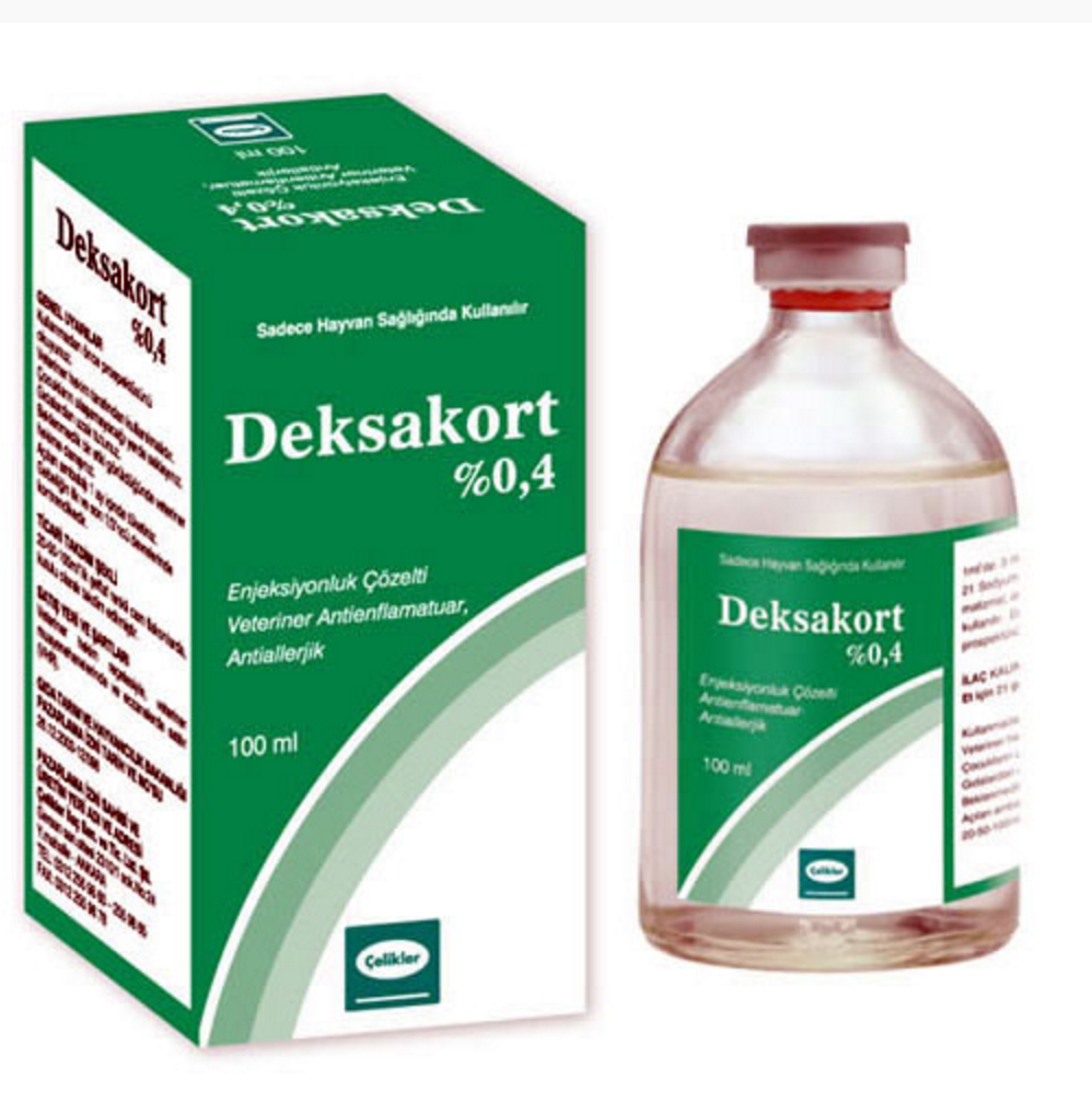 BİLEŞİMİ Deksakort % 0,4, beher ml.’de: 3 mg. Dekzametazon baza eşdeğer, 4 mg. Dekzametazon 21 Sodyum Fosfat içeren, berrak, renksiz, steril enjeksiyonluk bir çözeltidir. ENDİKASYONLAR Deksakort % 0,4; sığır ketozisinin sağaltımı başta olmak üzere; osteoartiritis, synovitis, bursitis, ödem, yaralanma, nonspesifik dermatitis ve yaz egzamasında antiinflamatuar ve antiromatizmal, yılan ısırması, böcek sokması, ilaç ve toksik madde zehirlenmeleri, dolaşım kollapsı, şok, dermatitis, ürtiker, egzama, astma, kaşıntı ve ışık hassasiyetinde antiallerjik ve/veya anaflaktik olarak kullanılır. Deksakort % 0,4; ayrıca akut mastitis, metritis, göbek toksemisi, travmatik gastritis, piyelonefritis, nakil hastalığı, operasyon stresi, pnömoni, eklem yangıları ve topallık, retensiyo sekundinaryum, yorgunluk, bitkinlik, influenza gibi olgularda ana tedaviyi destekleyici olarak da kullanılabilir. KULLANIM ŞEKLİ VE DOZU Terapötik Doz; klinik olguların şiddeti, hayvanın ilaca karşı hassasiyeti ve steroidlerin tedavi süreleri dikkate alınarak saptanmalıdır. Farmakolojik Doz; kas veya damar içi ve lokal (eklem içi) yollarla, tek doz şeklinde; geviş getirenlerde, 5-40mcg/kg. c.a, atlarda, 10 mcg/kg. c.a. etken madde hesabıyla uygulanır. Veteriner hekim tarafından başka bir şekil önerilmemiş ise. Pratik Dozaj Tablosu: