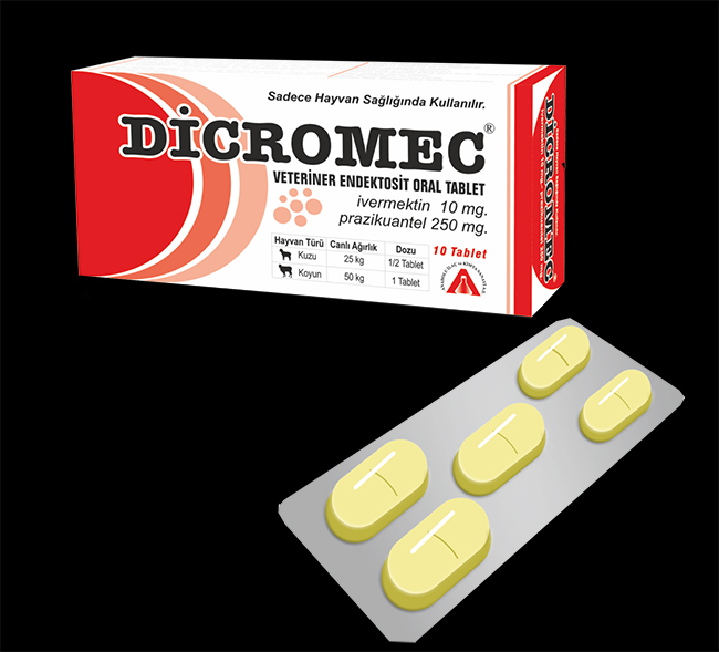 BİLEŞİMİ Dicromec Oral Tablet, 250 mg. Prazikuantel ile 10 mg. ivermektin içeren, sarı renkli oval ortadan çentikli birtablettir. ENDİKASYONLARI Dicromec Oral Tablet; Koyun ve kuzularda aşağıdaki iç ve dış parazitlerinin mücadelesinde kullanılan geniş spektrumlu endektosit ve sestosid kombinasyondur; Gastrointestinal Nematodlar (ergin ve larva): Haemonchus sp., Ostertagia sp., Trichostrongylus sp., Strongyloides papillosus., Oesophagostomum sp., Cooperia sp., Dictyocaulus sp., ergin ve larval formları. Sestod Türleri; Moniezia expensa, Stilesia globipunctata, Avitellina centripunctata, Cycticercus tenuicollis,"in ergin formları. Karaciğer kelebeği: Dicrocoelium dentriticum. Burun kurdu: Oestrus ovis. Uyuz Etkenleri: Psoroptes communis ovis, Sarcoptes scabei bovis. Kene: Boophylus sp. Bitler: Linognatus KULLANIM ŞEKLİ ve DOZU Dicromec Oral Tablet; Koyunlarda ve kuzularda ağızdan; tabletler elle veya tablet aparatı ile dilin kaidesine bırakılarak bol su ile yutturulur. Veteriner hekim tarafından başka bir seklide önerilmemiş ise, Farmakolojik dozu; Prazikuantel için; koyunlarda 5mg/kg.c.a., ivermektin ise 0.2mg/kg.c.a. hesabıyla kullanılır. Dicrocoelium dentriticum (kum kelebeği) tedavisinde Prazikuanteldozu 50 mg/kg .ca çıkarılmalıdır. Buna göre pratik doz; Kuzu (25 kg): 1/2 tablet - Koyun (50 kg): 1 tablet Yukarıdaki dozlar 3 ayda bir tekrarlanmalıdır. |