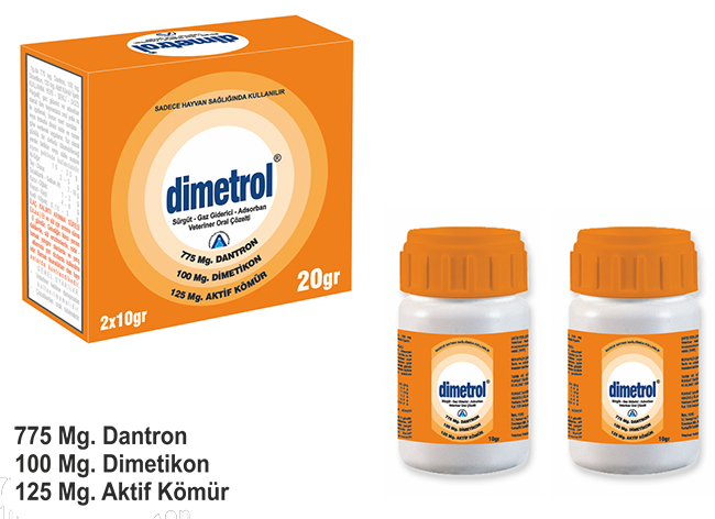BİLEŞİMİ DİMETROL; Beher g.da :775 mg. Dantron. 100 mg. Dimetikon ve 125 mg. Aktif (Tıbbi) Kömür içeren, portakal renkte, orai bir çözeltidir. FARMAKOLOJİK ÖZELLİKLERİ DİMETROL, pürgatif, gaz giderici ve adsorban özellikleri haiz bir karışımdır. Bileşimindeki; Dantron: (1.8-dihidroksi-antrikinon): Sentetik bir antrasen sürgütdür. Küçük dozlarda ılımlı (Laksativ) ve büyük dozlarda ise orta şiddette (purgativ) sürgüte yol açar. ince ve kalın barsaklarda sinir pleksuslarını uyararak peristaltik hareketleri arttırmak suretiyle etkir. Etkisinin oluşma süresi, sulandırılması ve barsakların doluluğuna bağlıdır. Fazla miktarda su ile verildiğinde; Atlarda etkisi 10-12 saat içinde ortaya çıkar. Midesi dolu hayvanlarda toz şeklinde uygulandığında etkinin ortaya çıkması 24-36 saat alabilir. Genelde küçük hayvanlarda 6-14 saat ve büyük hayvanlarda da 12-36 saat içinde sürgün oluşur. İdrar ve sütle vucuttan atılır. Dimetikon (Polimerize Metilsilikon) : Az miktarda, yüzey gerilimini artırırken köpüğün dayanıklılığını azaltır. Bu grup İlaçlar; köpük söndürücü, köpük dayanıklılığını azaltan ve antifrotting maddeler olup; retikulum ve rumendeki sıvının yüzey gerilimini arttırarak, içerdeki hapsolmuş gaz kabarcıklarının dışarıya çıkmasını kolaylaştırırlar. Neticesinde rumendeki sıvı tabakasının yüzey gerilimi artınca, gaz kabarcıkları içerikten dışarıya çıkar ve rumenin üst kısmında toplanarak, ğeğirme veya mide sondası ile vücut dışına çıkarılır. Sadece köpüklü şişkinliklerde kullanılır gaita ile vucuttan atılır. Aktif Kömür (Charcoal): Adsorban niteliği sayesinde, bir yandan sakıncalı ölçülerde şekillenmiş gazları (Dimetikon sayesinde açığa çıkan köpüklü gazları) emerek, mide bağırsak şişkinliğini (Meteorismus) azaltırken, Dantron ile birlikte bağırsak içeriğinin hızla atılım neticesi klinik tabloyu ortadan kaldırır. Gatia ile vucuttan atılır. ÖZEL KLİNİK BİLGİLER ve HEDEF TÜRLER İÇİN ÖZEL UYARILAR Gebeliğin ikinci yarısındaki hayvanlarda, süt emzirenlerde, mide bağırsak yangısı olanlarda yukarıdaki sağaltım dozlarının yarısı kullanılmalıdır. Saf ve sıcak kanlı atlar ilaca nispeten hassas olduğundan daha düşük dozlar verilmelidir. Akut timpani asfeksi ve kalp yetmezliğini (Rumen şişkinliğinin kalp ve akciğer üzerindeki baskısı sebebiyle) önlemek için kalp ve solunum analeptikleri ile birlikte uygulanması tavsiye edilir. DOZ AŞIMINDA BELİRTİLERİ, TEDBİRLER, ANTİDOT Belirtilen dozlar aşılmamalıdır, çok yüksek dozda, sıkça kullanıldığında dehitrasyona neden olabilir. |