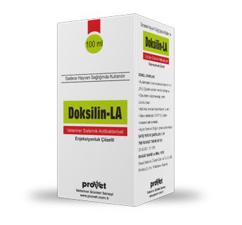 BILEŞIMI Her ml.si 200 mg Doksisikline eşdeğer Doksisiklin Monohidrat içerir. KULLANIM SAHASI Sığırlarda doksisikline duyarlı bakterilerden kaynaklanan ; Solunum sistemi hastalıkları ( Sinusitis , Mycoplasmosis ) KULLANILIŞI VE DOZAJ Veteriner hekim tarafından başka bir şekilde tavsiye edilmediği takdirde; kas içi ve deri altı yolla 20 mg/kg canlı ağırlık dozda (1 ml/10 kg canlı ağırlık) uygulanır. Gerekli görüldüğünde 72 saat sonra doz tekrarı yapılabilir. |