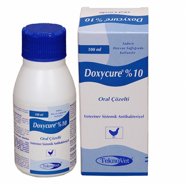 BİLEŞİMİ Sarı-kahverengi berrak görünümlü bir çözelti olup her ml’sinde 100 mg doksisiklin’e eşdeğer doksisiklin hiklat ve koruyucu olarak 4 mg sodyum formaldehit sülfoksilat içerir. KULLANIM SAHASI / ENDİKASYONLARI Tavuklarda, doksisikline duyarlı mikroorganizmaların neden olduğu colibasillosis, kronik solunum sistemi hastalığı (CRD) ve mycoplasmosis’in tedavisinde kullanılır. KULLANIM ŞEKLİ VE DOZU İçme suyuna karıştırılarak uygulanır. Tavuk: 11.5 - 23 mg doksisiklin hiklat/kg canlı ağırlık/gün dozunda (0.1 – 0.2 ml Doxycure %10 /kg canlı ağırlık/gün) 3-5 gün boyunca uygulanır. İçme suyu ile uygulamada aşağıdaki formüle göre pratik doz hesaplanabilir; 0. 1 – 0.2 ml Doxycure %10/kg canlı ağırlık/gün x tedavi edilecek hayvanların ortalama canlı ağırlığı (kg) = Her litre içme suyuna katılacak ürün miktarı Her hayvan için günlük su tüketimi (litre) Doğru bir dozajlama için hayvanların vücut ağırlığı mümkün olduğunca doğru hesaplanmalıdır. İlaçlı suyun hayvanlar tarafından alımı klinik duruma göre değişebilmektedir. Bu nedenle doğru dozun sağlanabilmesi için ilaçlı suyun konsantrasyonunun ayarlanması gerekebilir. Uygun kalibre ağırlık ölçüm ekipmanlarının kullanımı tavsiye edilir. İlaçlı suya katılacak günlük miktar 24 saat içerisinde tüketilecek şekilde ayarlanmalıdır. İlaçlı su her 24 saatte bir taze olarak hazırlanmalıdır. Ürünün önce bir miktar su ile iyice karıştırılması (konsantre ön karışım oluşturma), ardından gerekli ise bu karışımın gerekli oranda su ile sulandırılması tavsiye edilir. Tedavi edilmesi düşünülen tüm hayvanların ilaçlı su kaynaklarına rahatça erişebildiğinden emin olunmalıdır. Ürünün sub-terapotik dozda alımının önüne geçmek için tedaviden sonra sulama ekipmanları yeterince temizlenmelidir. Tedavi süresince ilaçlı su hayvanların tek su kaynağı olmalıdır. İlaçlı su metal kap içinde hazırlanmamalı veya depolanmamalı, paslanmış ekipman kullanılmamalıdır. Çözünürlük pH’ya bağlı olup, yüksek alkali özellikli içme sularında çökelme meydana gelebilir. GIDALARDA İLAÇ KALINTILARI HAKKINDA UYARILAR İlaç Kalıntı Arınma Süresi (İ.K.A.S.): Tedavi süresince ve son ilaç uygulamasından sonra tavuklar 7 gün geçmeden kesime gönderilmemelidir. İnsan tüketimi için yumurta elde edilen kanatlılarda kullanılmaz. Yumurtlayan tavuklarda yumurtlama döneminin başlangıcına 4 hafta kaladan itibaren kullanılmamalıdır.