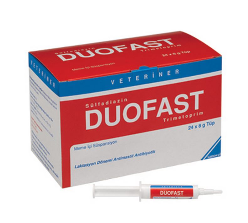 BİLEŞİMİ Her 8 g’lık tüpte; 40 mg trimetoprim ve 200 mg sülfadiazin içerir. ENDİKASYONLARI Duofast Meme İçi Süspansiyonu, laktasyondaki ineklerde Streptococcus agalactiae, Streptococcus dysgalactiae, Streptococcus uberis ve diğer streptokok türleri, stafilokok türleri, Corynebacterium pyogenes, Escherichia coli ve diğer gram negatif bakteriler dahil gram pozitif ve gram negatif bakterilerin neden olduğu mastitisin tedavisinde kullanılır. KULLANIM ŞEKLİ VE DOZU Sağımdan sonra her bir enfekte meme lobuna bir tüp olmak üzere 12 saat arayla 3 defa uygulanır. Uygulamadan önce meme başı iyice temizlenmeli ve dezenfekte edilmelidir. Tüpün başlığının kontamine olmamasına dikkat edilmelidir. Uygulamadan sonra meme başının tekrar dezenfekte edilmesi önerilir. |