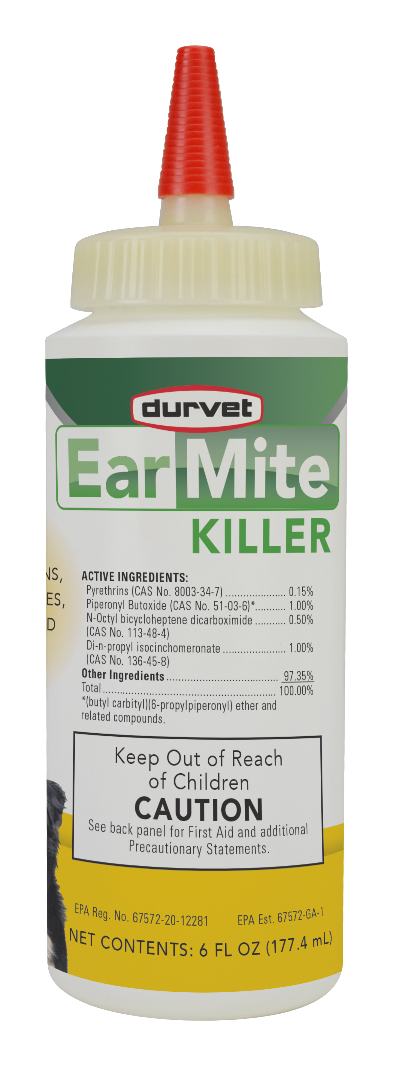 Aloe ve Lanolin içeren Durvet Ear Mite Killer, temas halinde öldürür ve 3 ila 5 gün boyunca maruz kalan cilt yüzeylerinde kulak akarlarını, pireleri, keneleri, sivrisinekleri, sinekleri, sivrisinekleri ve uyuz akarlarını kovar.