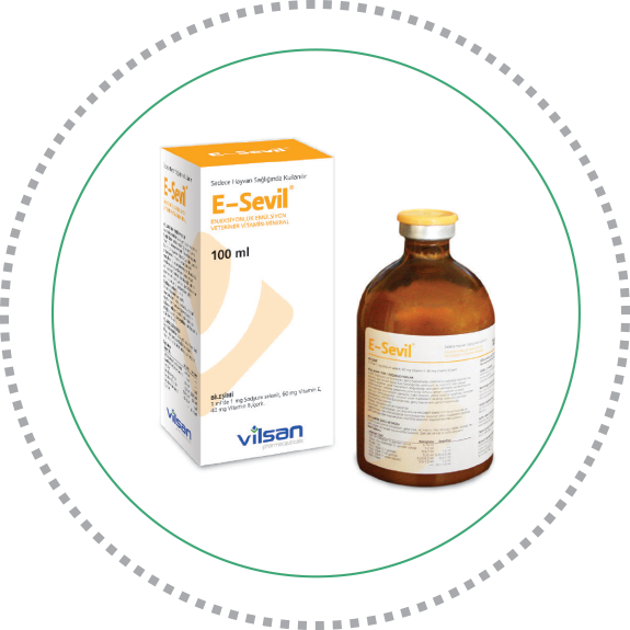 E-Sevil enjeksiyonluk emülsiyon gebe inek, at, koyun, keçi ile kuzu, oğlak, buzağı, tay, kedi ve köpeklerde kullanılır. Deri altı ve kas içi yolla uygulanır. Gerektiği taktirde 1 hafta sonra doz tekrarlanır. Devamlı tedavide 2 hafta ara ile en çok 4 doz uygulanabilir.