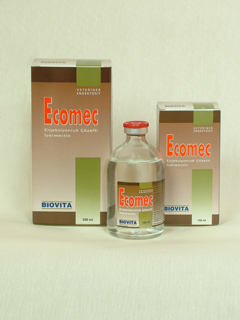 ECOMEC ECOMEC enjeksiyonluk çözelti, renksiz veya hafif sarı, berrak, homojen, steril bir çözelti olup 1 ml’sinde 10 mg ivermektin içerir. KULLANIM SAHASI/ ENDİKASYONLARI ECOMEC enjeksiyonluk çözelti sığır ve koyunlarda aşağıdaki tabloda belirtilen iç ve dış parazitlere karşı kullanılır; Sığırlarda Gastro-intestinal nematodlar: Heamonchus placei, Ostertagia sp., Ostertagia ostertagi (erginler, larval devreler, hipobiotik larvalar), O.Iyrata (erginler, L4 larvalar), Mecistocirrus digitatus (erginler), Trichostrongylus axei, T.Colubriformis, Cooperia oncophora, C.Punctata, C.Pectinata, Cooperia sp., Nematodirus helvetianus (erginler), N.Spathiger (erginler), Oesophagostomum radiatum, Strogyloides papillosus (erginler), Bunostomum phlebotumum, Toxacara vitulorum. Koyunlarda Gastro-intestinal nematodlar: Heamonchus contortus, Ostertagia sp., Trichostrongylus sp., Cooperia sp., Nematodirus sp., Oesophagostomum sp., Strogylus papillosus, Chaberthia ovina, Trichuris ovis KULLANIM ŞEKLİ VE DOZU ECOMEC enjeksiyonluk çözelti sadece deri altı yolla uygulanır. Sığırlarda boyun bölgesinde veya scapula gerisinde gevşek deri altına, koyunlarda koltuk altı veya koltuk arkasında derinin gevşek bölgesine deri altı yolla enjekte edilir. Uygulama yapılırken asepsi ve antisepsi kurallarına uyulmalı, kuru, steril iğne ve enjektör kullanılmalıdır. Pratik Doz Tablosu: