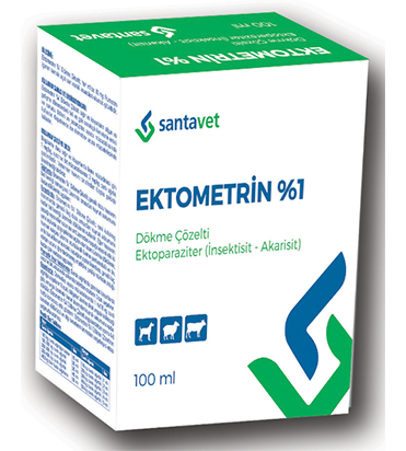 Ektometrin %1 Bileşimi: Ektometrin Dökme Çözelti; her ml’sinde 10 mg Flumetrin içeren berrak açık sarı renkli insektisit akarisit çözeltidir. FARMAKOLOJİK ÖZELLİKLERİSentetik tip II pretroit olan flumetrin insektisit ve akarisit etkilidir. Flumetrin keneler üzerinde etkisini olgun keneler ile bunların larva ve nimf’lerini öldürerek ve dişi kenelerin canlı yumurta yapmalarını önleyip üremelerini engelleyerek gösterir. Diğer sentetik pretroitler gibi temas yoluyla etki eder. Pretroitler genel olarak yağ dokusuna affinite duyarlar. Derinin stratum korneum tabakasındaki hücreler arası bölgedeki yağlı dokularda birikerek tüm deri yüzeyine yayılırlar. Flumetrin ile temasa geçen bir parazitin sinir dokusundaki sodyum kanalları sürekli açık kalır ve bu şekilde sinir iletimi bloke edilir, bu durum parazitlerin felcine neden olur. Ektometrin %1 dökme çözelti önerilen şekilde uygulandıktan 4 saat sonra tüm deri yüzeyinde dağılır, bir gün sonra ise ayaklar dahil tüm deri yüzeyinde önemli kene türlerinin eliminasyonu için yeterli konsantrasyona ulaştığı saptanmıştır. Ektometrin %1 dökme çözeltinin sistemik etkisi yoktur. Çok az miktarda deriden emildiğinden kalıntı değerleri kabul edilen kalıntı limitlerinin çok altında kalmaktadır. Metabolitleri ( flumetrin asit ) idrar ve dışkı ile atılır. Ektometrin %1 dökme çözelti uygulandıktan 4-8 hafta boyunca deri üzerindeki etkinliğini korur. Bu süreyi çevre, ısı ve kene miktarının yoğunluğu gibi faktörler etkiler. Toksisite : Piretroitler en güvenli ektoparazitlerdir. Dünya Sağlık Örgütü’nün sınıflandırmasına göre toksisite sınıfı II’dir. Flumetrin akut oral LD50 değeri ratlarda > 500 < 1000 mg/kg, akut dermaL LD50 değeri ise > 5000 mg/kg’dır.