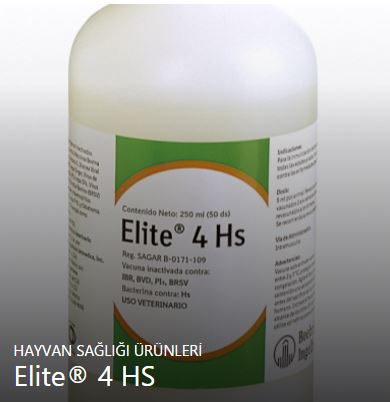 Elite® 4 HS Sığırlarda solunum sistemi ve reprodüktif sistem hastalıklarına karşı, kullanıma hazır enjeksiyonluk süspansiyon, inaktif viral ve bakterin aşı Bileşimi Beher doz Elite® 4 HS içeriğinde Endikasyonları Uygulama Şekli ve Dozu Hayvan başına kas içi (im) yolla 5 ml uygulanır. Kullanmadan önce flakon iyice çalkalanmalıdır. |